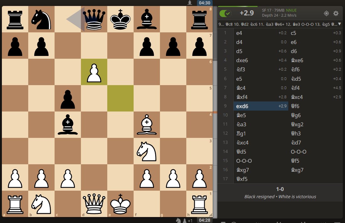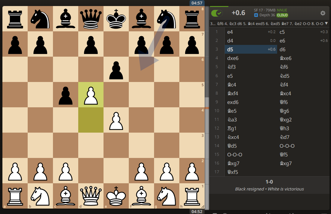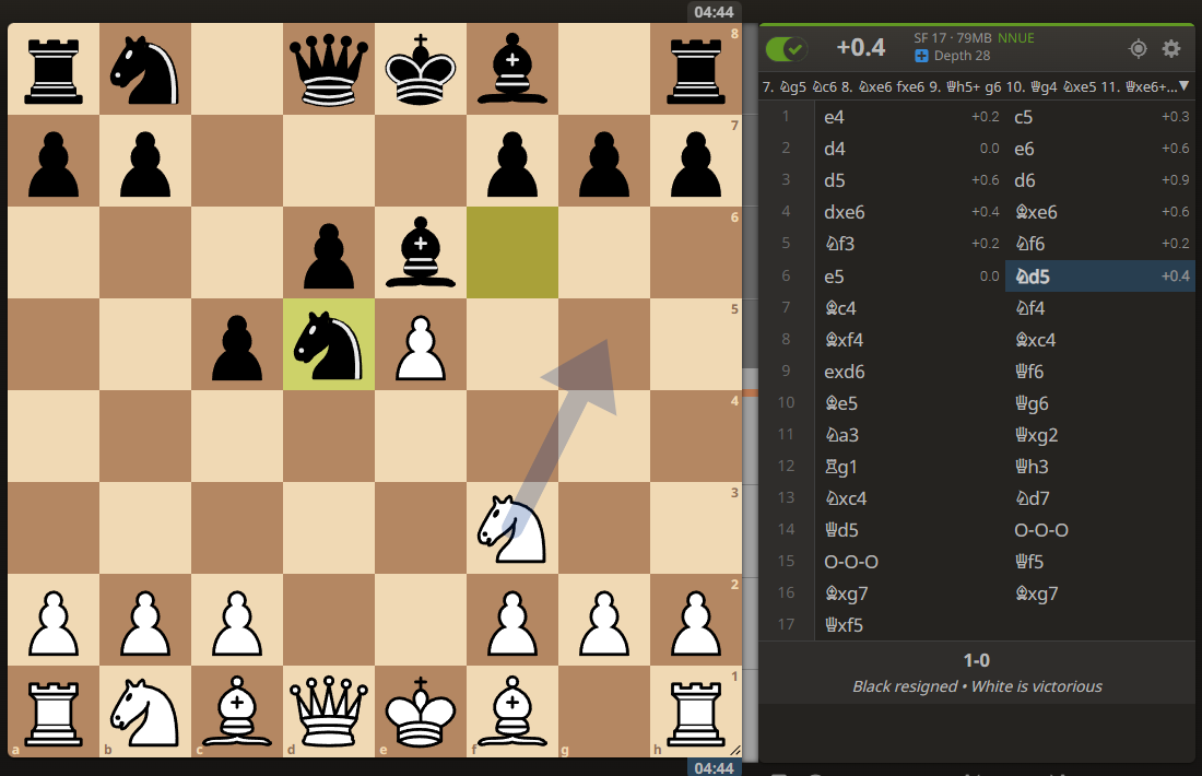 Теперь место того, чтобы спокойно укрепить центр ходом 6. Кc3, как советует анализатор, я решил сыграть резко и дерзко.