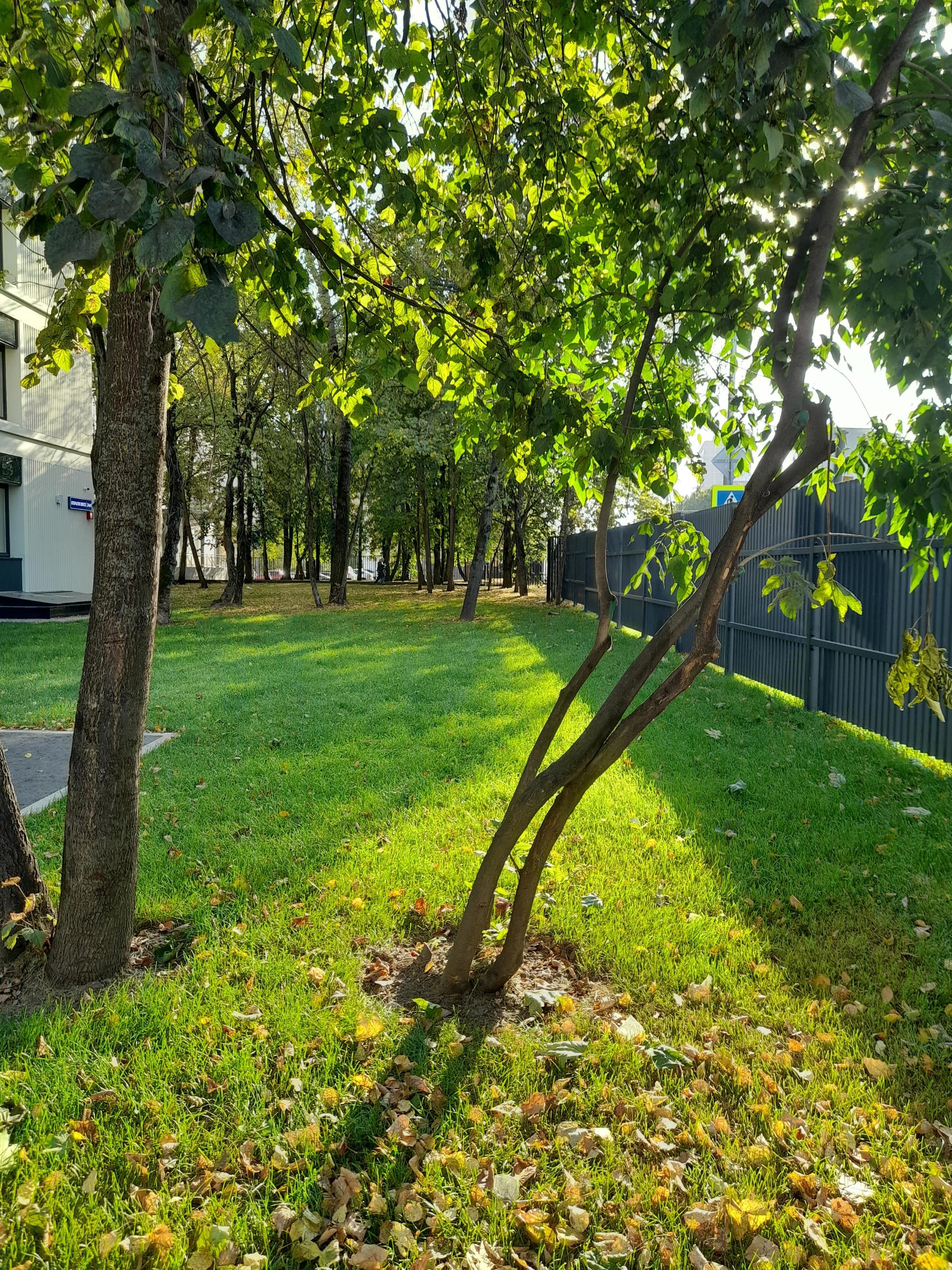 Листва уже в траве частично, но и на деревьях ее хватает)) Причем зеленой.