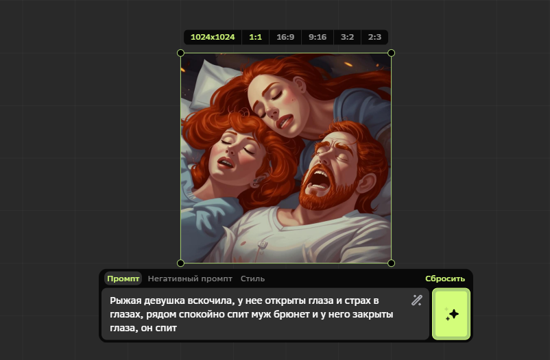 Автор: Марина ИрсайЯ рукожопка, написала нейросети: «Рыжая девушка проснулась от ужасного сна, у нее открыты глаза и страх в глазах, а муж брюнет спокойно спит рядом», сто пятьдесят вариантов мужей и жен, и у всех закрыты глаза, что я делаю не так в Кандински?!