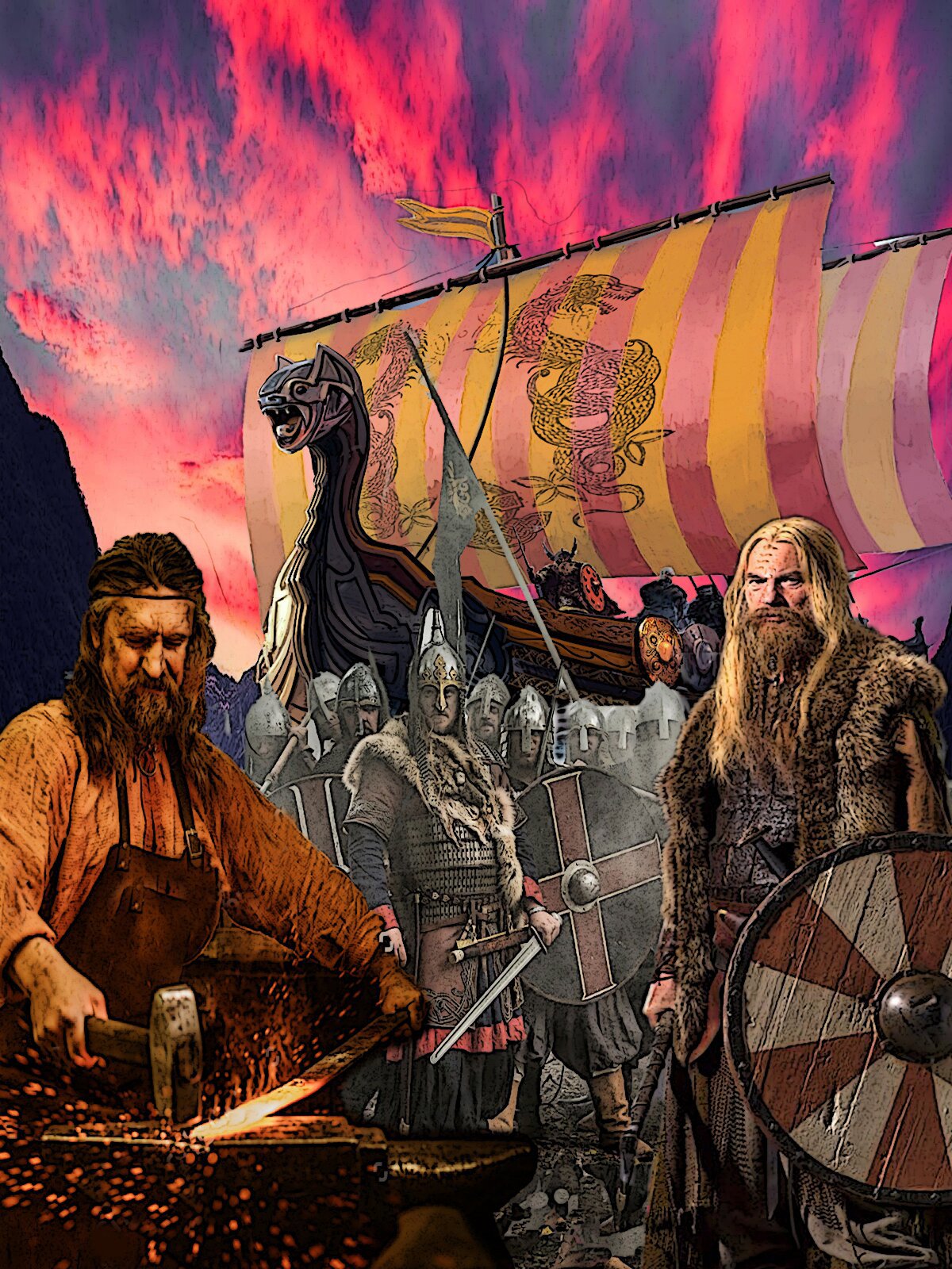 Да, здесь пока нет точки завершения: рамка, тип шрифта надписей, их цвет и расположение обсуждаются. Но это точно судно викингов, не смотря на полосатость паруса, и это не "дракон" на нём, а "морской змей". Более реально выглядит кузнец Уле (время ковки первого "говорящего меча") и солнце присутствует, именно в тех тонах, которые имеют место по тексту, даже стена фьорда к месту. Но... опять имеется ряд допущений в стилизации (естественно, с точки зрения автора текста). На мои пояснения-замечания многие отвечают: "забей на сомнения, читатель - не исследователь атрибутов той эпохи, ему интересно само произведение... Главное в обложке - привлекательность, способность впечатлить любого, кто возьмёт в руки такую книгу, сама обложка стимулирует желание прочесть её, прочесть сразу, не вникая в аннотацию и предисловие". И они правы... Но сомнения мои остаются, потому что правы они опять "отчасти". Любой, кто в "теме" будет иметь очередные претензии, а почитавший - недоумение: светловолосый староват для Фредрика Неугомонного, почему шлемы дружины Хальвдана Чёрного норманнской эпохи (XI-XII вв.), а на щитах кресты, не руна "Х", а именно кресты, да и сами руны-обереги наносились по наружному краю щита ( не менее 3-х и не более 5-ти). Да, всё это я старался донести до мастеров обложек, но ограниченность "картинного" материала для качественного, с точки зрения реалий эпохи, оформления сыграло свою роль. Третий вариант мне ближе по смыслу, а второй по впечатлениям, которые он производит... Конкретный же выбор ещё не сделан. Уверен, на сайте есть читатели , знакомые с текстом "Солнце..." вот к ним я и обращаюсь, для того чтобы сделать окончательный выбор.
