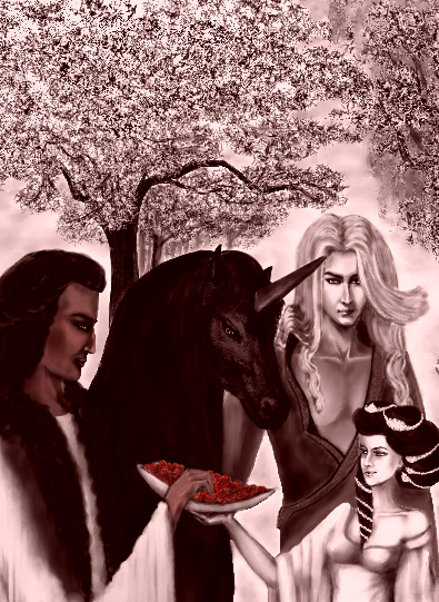 И авторский рисунок к этой сцене. Боги, единорог и женщина-полукровка: