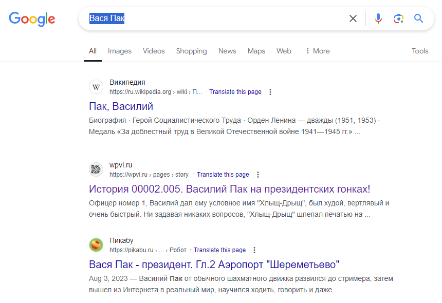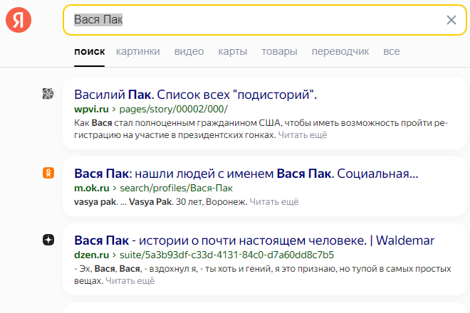 Вот как сейчас чувствует себя "Вася Пак" по запросам в Яндексе и Гугле (скриншоты) -