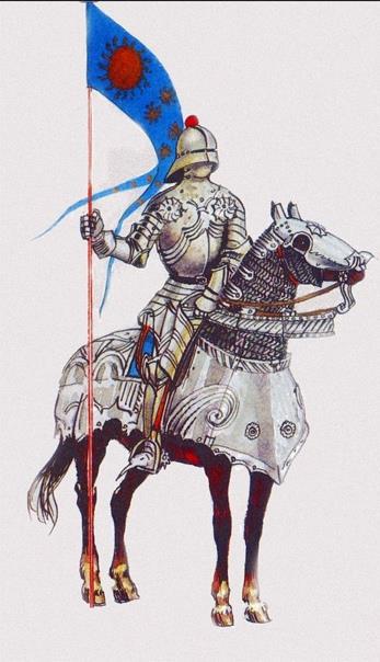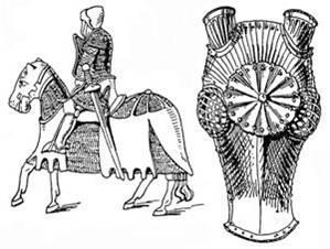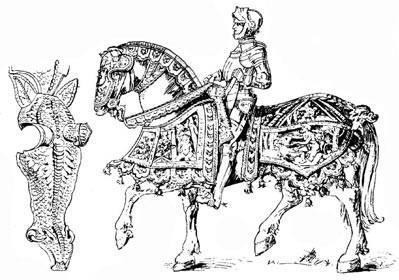 Жандарм Карла VII. Лошадь его покрыта немецкой броней той же эпохи, т.е. второй половины XV века. Броня украшена бороздками. Латы крестца образуют большую попону, покрывающую весь зад лошади до почек, защищенных большими пластинками боевого седла, откуда идут крепкие железные прутья, держащие лопатку луки. Боковые прикрытия покрывают с обеих сторон бока лошади и соединяются с латами груди, расположенными скошенным полукругом, чтобы не стеснять коня. Шея покрыта сверху латами, состоящими из дугообразных накладок, прикрепленных на кольчугу, покрывающую всю шею. Наглавник с неполными наушниками образует защиту для глаз; ноздри покрыты поднятыми в виде раковины пластинками. Граненые шишечки мундштука сделаны из стали; поводья, находясь в зависимости от длинных ремней мундштука a connetable, покрыты полосками; поводья состоят из ремней. Спереди шеи кольчуга неплотно прилегает к телу и спускается на латы груди; вероятно, в военное время эти части соединялись более прочно. Очень прочная кольчуга состоит из звеньев и колец, нарезанных резцом, что образует ткань чрезвычайной прочности.