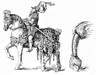 С начала XIII столетия лошади покрываются длинными чепраками из материи, и это делалось не ради желания украсить лошадь, но главным образом чтобы хоть несколько предохранить ее от стрел, а также ударов меча или топора, которые нередко ранили животное в поджилки. Мера эта была, вероятно, введена на Востоке, во время крестовых походов, против турецких стрел. В эти же времена лошади особо высокой знати покрывались попоной из кожаных полос с нанизанными на них кольцами, позднее даже кольчугой. Это были те же самые материалы, которые применялись для и кольчужной рубахи.