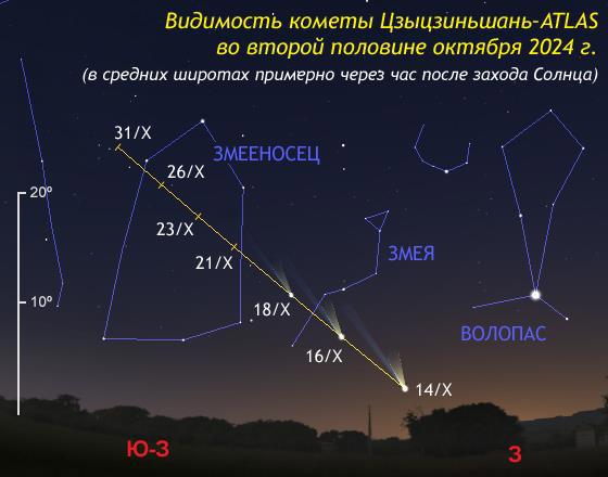 "А несколько дней спустя, в 10-х числах октября (через 2-3 недели после перигелия), C/2023 A3 появится на вечернем небе северного полушария, хоть и слабея с каждым днём, но поднимаясь всё выше над горизонтом. Первые недели после сближения с Солнцем — то самое время, когда пылевые хвосты комет становятся наиболее длинными и выразительными, так как подогретое «жаром» нашего дневного светила ядро кометы выбрасывает большое количество пыли, вытягивающейся в длинный хвост как раз к этому периоду времени. Хвост у кометы Цзыцзиньшань–ATLAS может оказаться даже очень-очень".