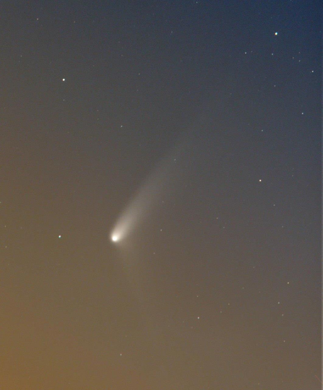Яркий хвост, направленный вправо-вверх, -- газовый, направленный прочь от Солнца. Но у кометы развивается и пылевой хвост, протянутый вдоль орбиты (на частицы пыли давление света почти не действует). На фото он направлен вправо-вниз.