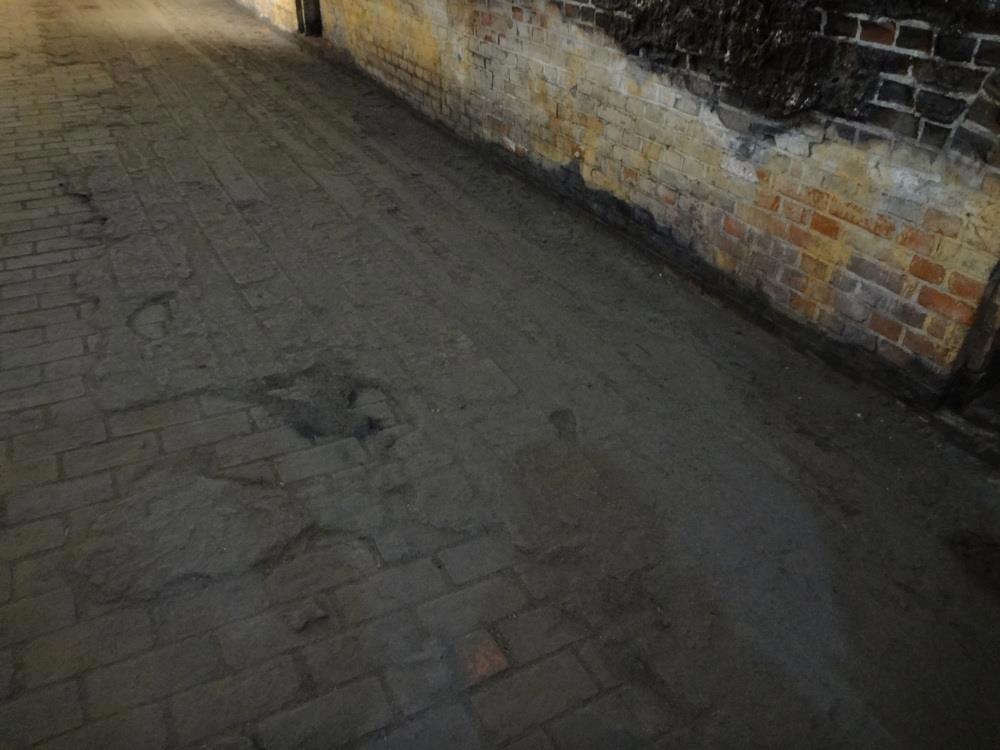 Пол в арсенальном зале залит битумом - опять же чтоб никаких искр, даже если какой дурак припрется в подкованых сапогах. После пожара не весь и выгорел - видны остатки слоя.