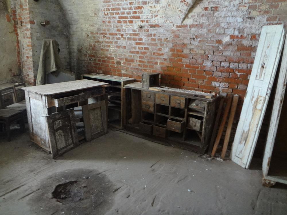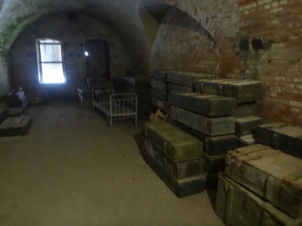 Бывший пороховой погреб, позже - арсенал. Всякие стеллажи и прочая мебель сгорела после войны - наши не стали разминировать кучу взрывоопасного дерьма, щедро политого протекающей из резервуаров огнеметной смесью и просто все спалили. И да - тут полно плавленых кирпичей.