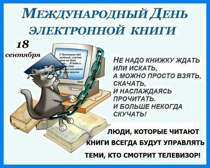 Ежегодно 18 сентября отмечается День электронной книги. Впервые праздник провели в 2014 г., чтобы привлечь внимание читателей к электронному книгоизданию.