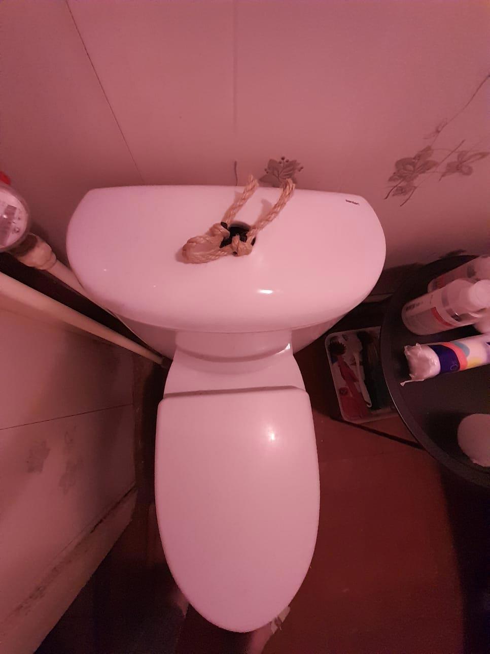 Крышка от сортируса нашлась под ванной. Там сломалась часть сливного механизма, где надо вверх тянуть. Сообразила из 4 стяжек и куска джутового каната решение. Ну и внутри там теперь всё прозрачно: литр санокса в 3 захода убрал ржавый трэш. Ванну ждет акрил, но это уже не в этом месяце.