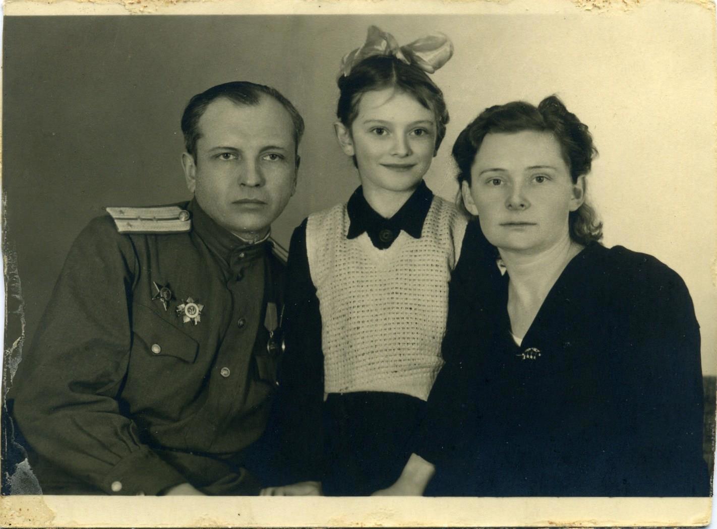 Василий Тимофеевич, Наталья Николаевна и Иринка в 1947 году: