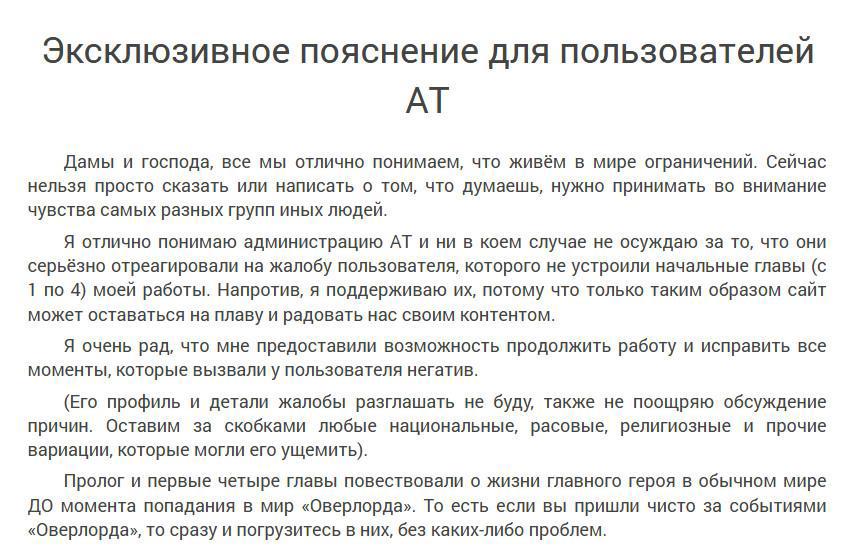 Честно говоря, прочитав это, я была, мягко говоря, сильно удивлена и обескуражена. Оказывается, в первых главах автор задел чувства некоей группы людей, которые потребовали удаления текста. В комментариях ему изо всех сил сочувствуют читатели, возмущаясь тем, кто донес, и администрацией АТ, пошедшей на поводу у доносчика. А автор чистит комментарии, в которых объясняют, за что именно снесли. И при этом пытается натянуть на себя белый плащик.