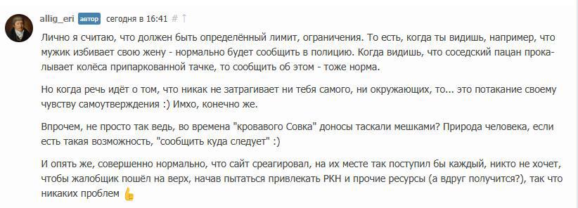 Оказывается, если ты обнаруживаешь воровство чужой истории, это не задевает ни тебя, ни окружающих, а значит, сообщая об этом администрации портала, ты просто самоутверждаешься за счет того, кто спер. И вообще, сообщение о воровстве -- это донос. А донос -- это нехорошо. Воровать же, по мнению данного автора, можно и правильно. Ведь если твой собственный текст очень уступает тексту спертому, то чем тогда привлекать читателя?