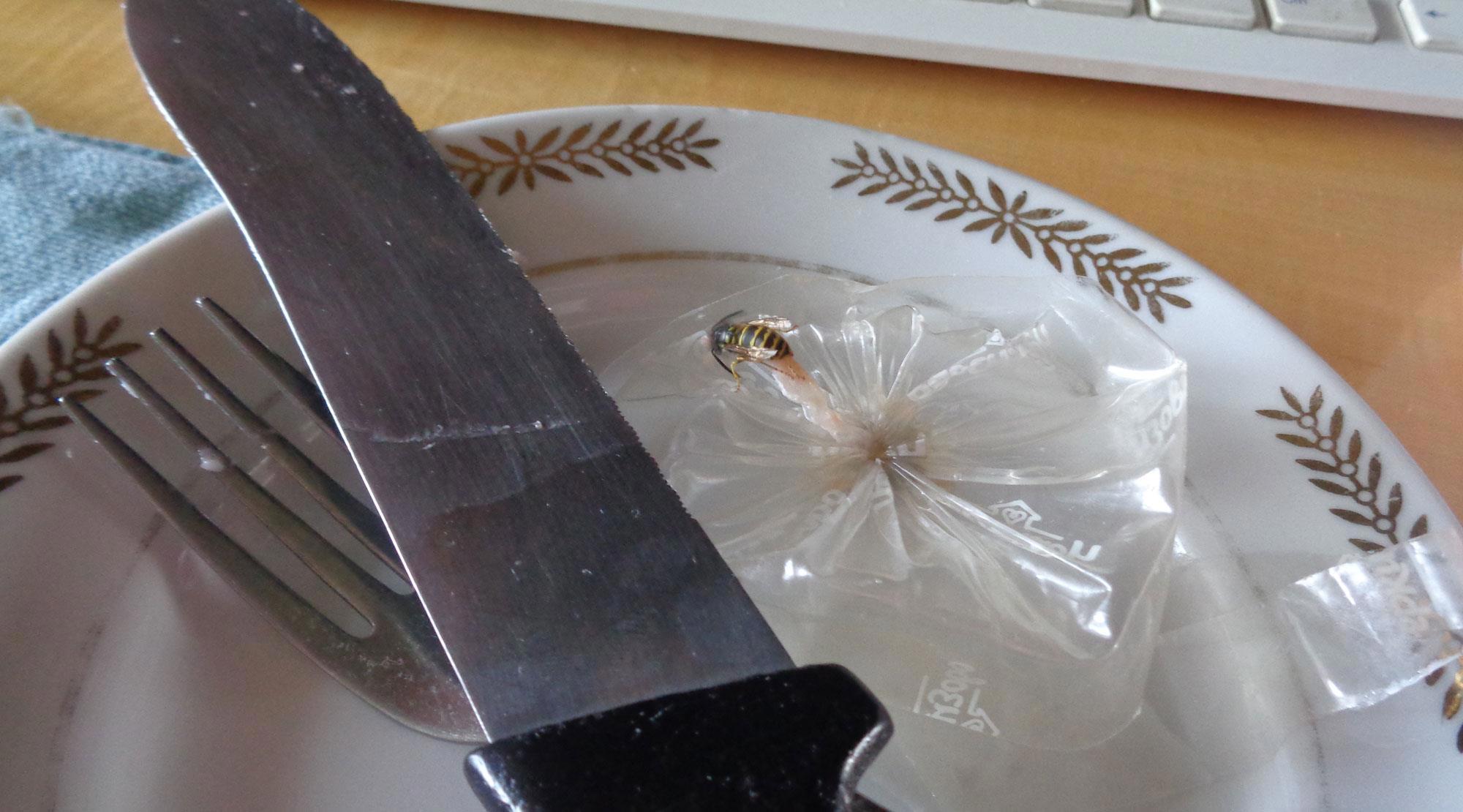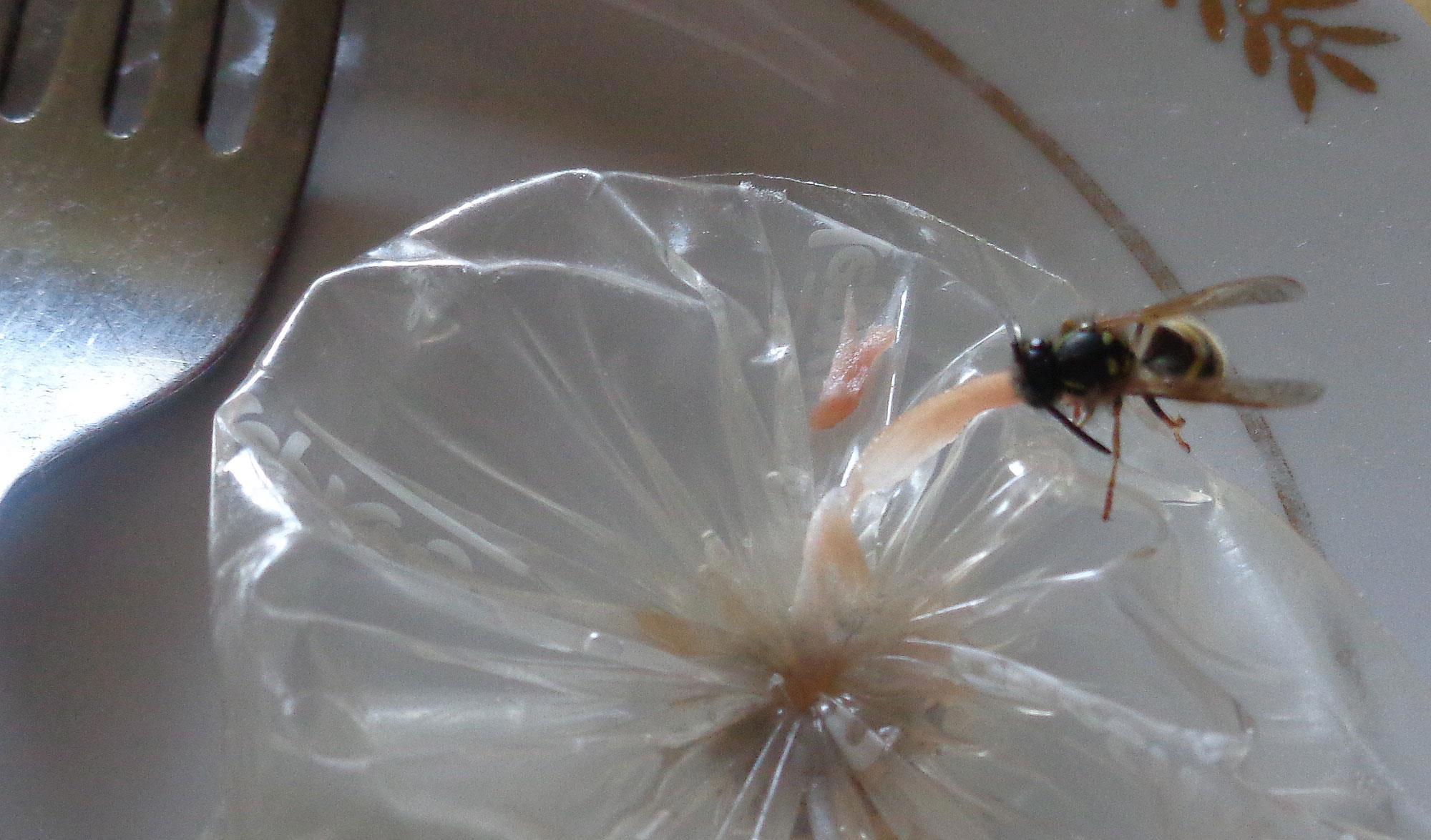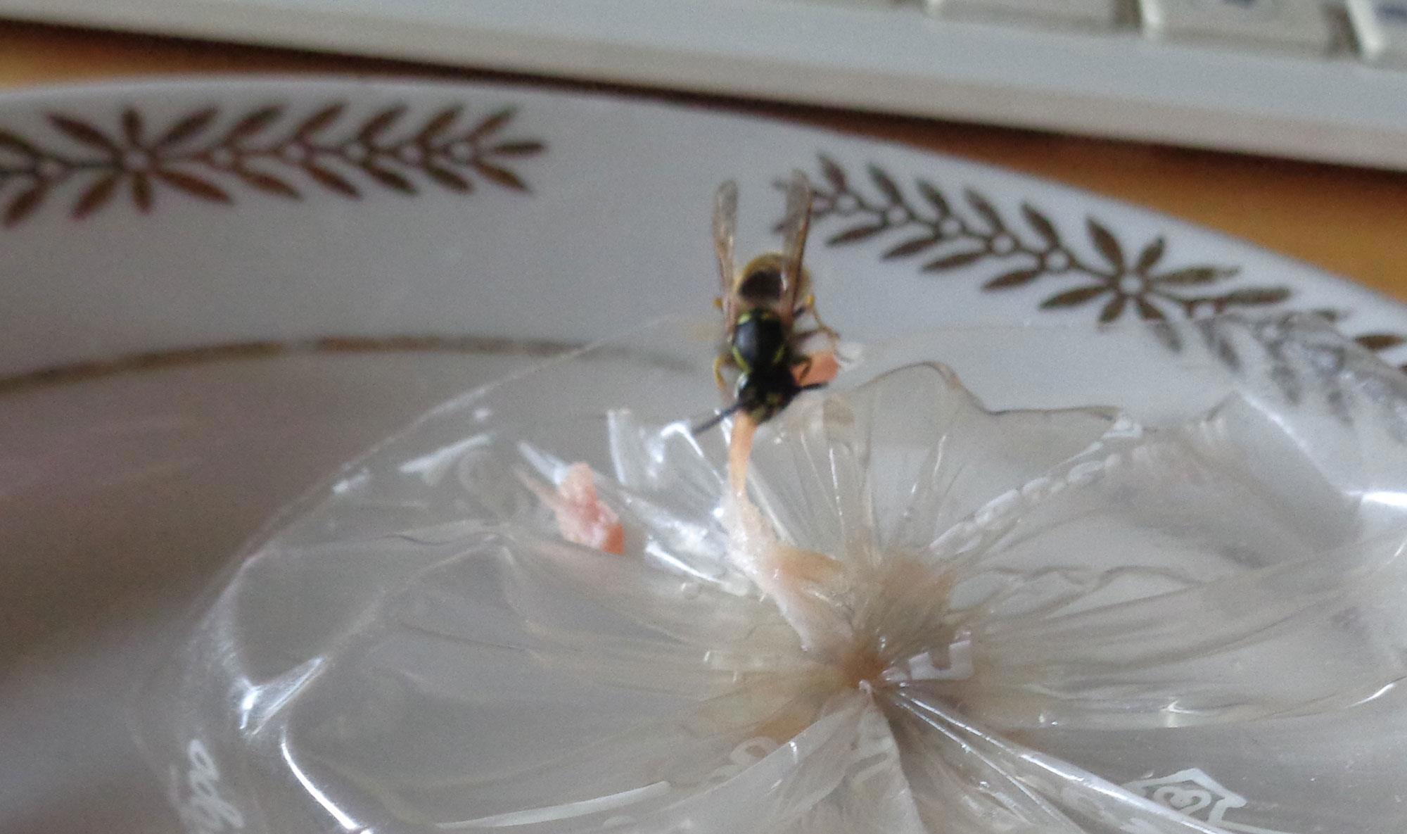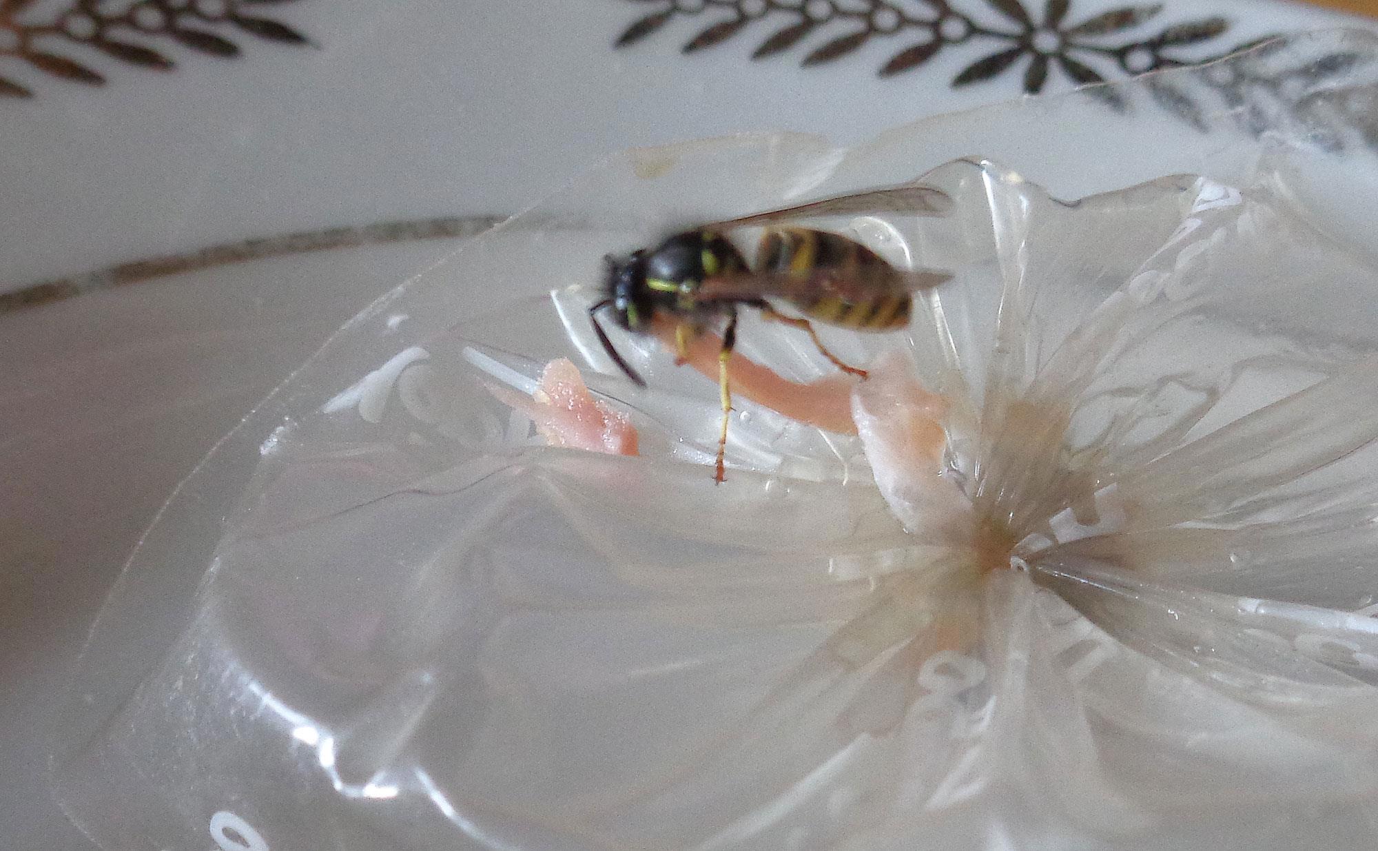 Оказывается, ветчину осы тоже любят. На фото - оса пытается оторвать приставший к упаковочному полиэтилену кусочек ветчины "Черкизовская". Как она старалась! И кувыркалась, и тянула, пока не оторвала небольшой кусочек, зажала его передними лапами и улетела. Ещё успела побиться в стекло, пока я не открыла ей окно, но и тогда кусок не выронила. Так с ним и улетела.