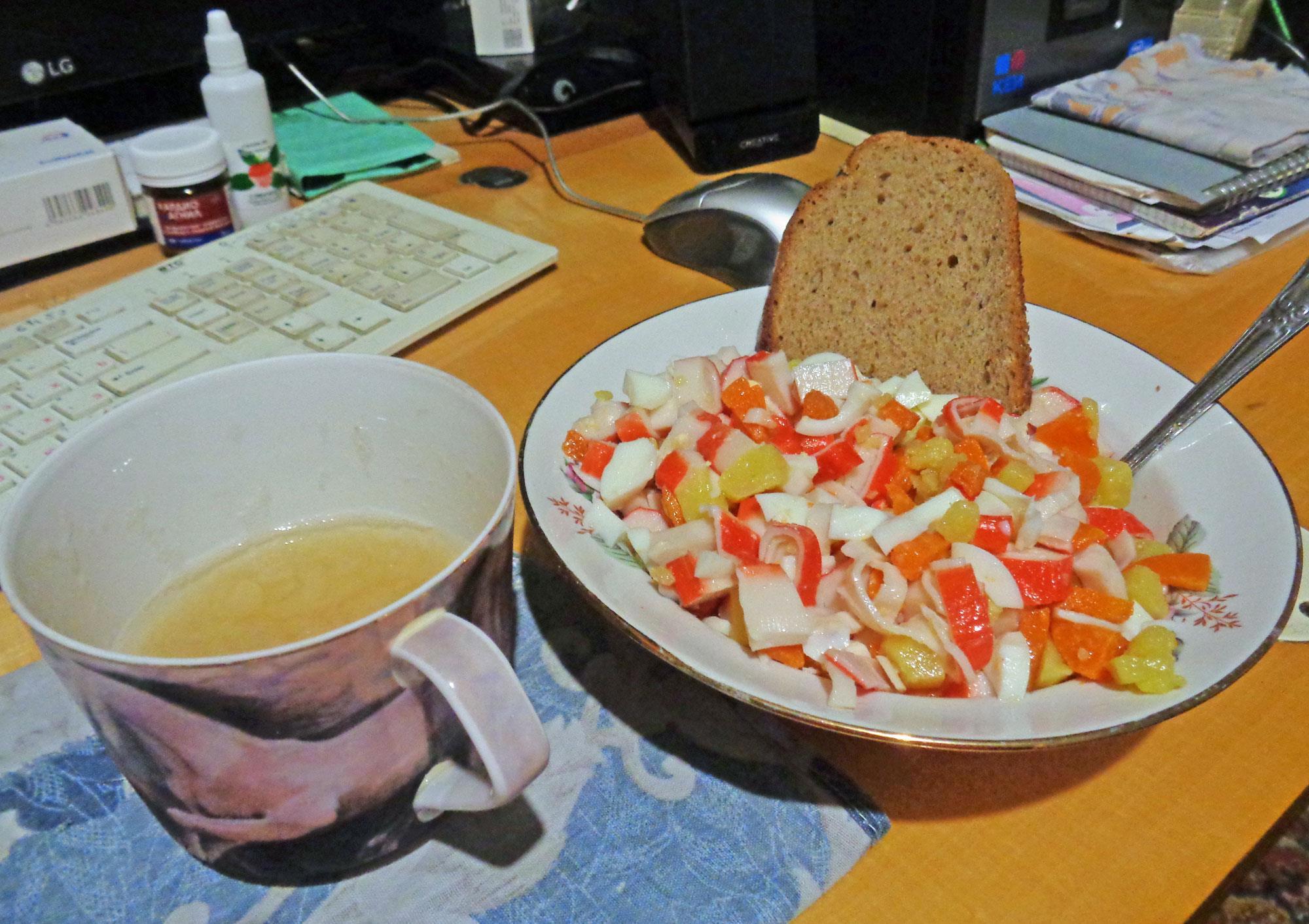 Компотик и салатик (крабовые палочки, яйца, морковка, картошка и подсолнечное масло). Вкуснотень!