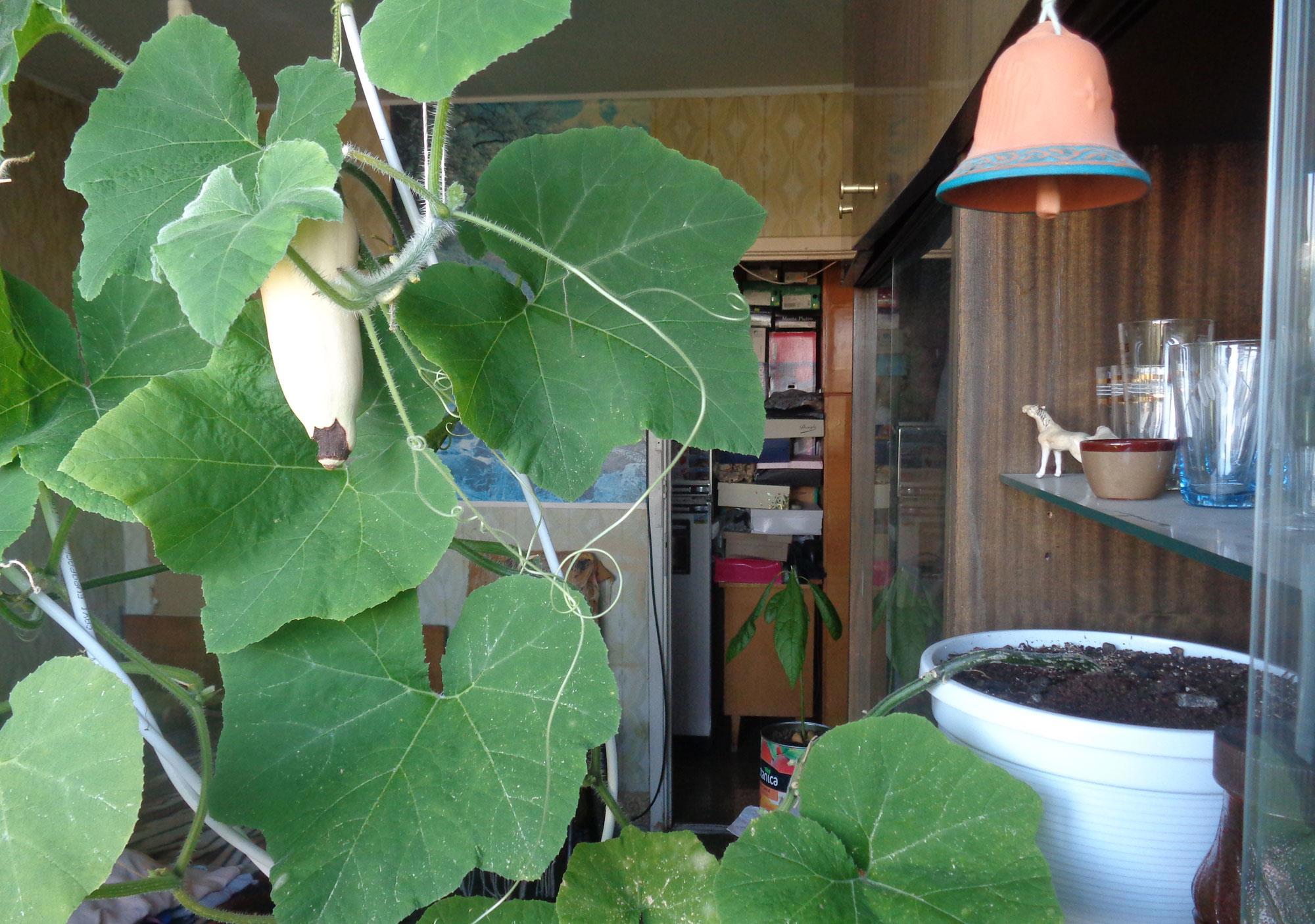 Моего баттерната больше нет. Этот кадр сделан 8 сентября, тут она ещё нормальная, здоровая. А пару дней назад не закрыла на ночь большое окно, а бы сильный туман. Перепад температуры и сырость стимулировали заболевание "мучнистая роса". На всех листьях пошли серо-белые круглые пятна как будто присыпанные мукой. Они стали быстро разрастаться и захватывать все листья. Обычно оно дремлет на каждом растении, дожидаясь неблагоприятных условий. Пришлось тыкву ликвидировать, чтобы не заразились другие. Жалко было! Мы к ней привязались! Но плод не пострадал!