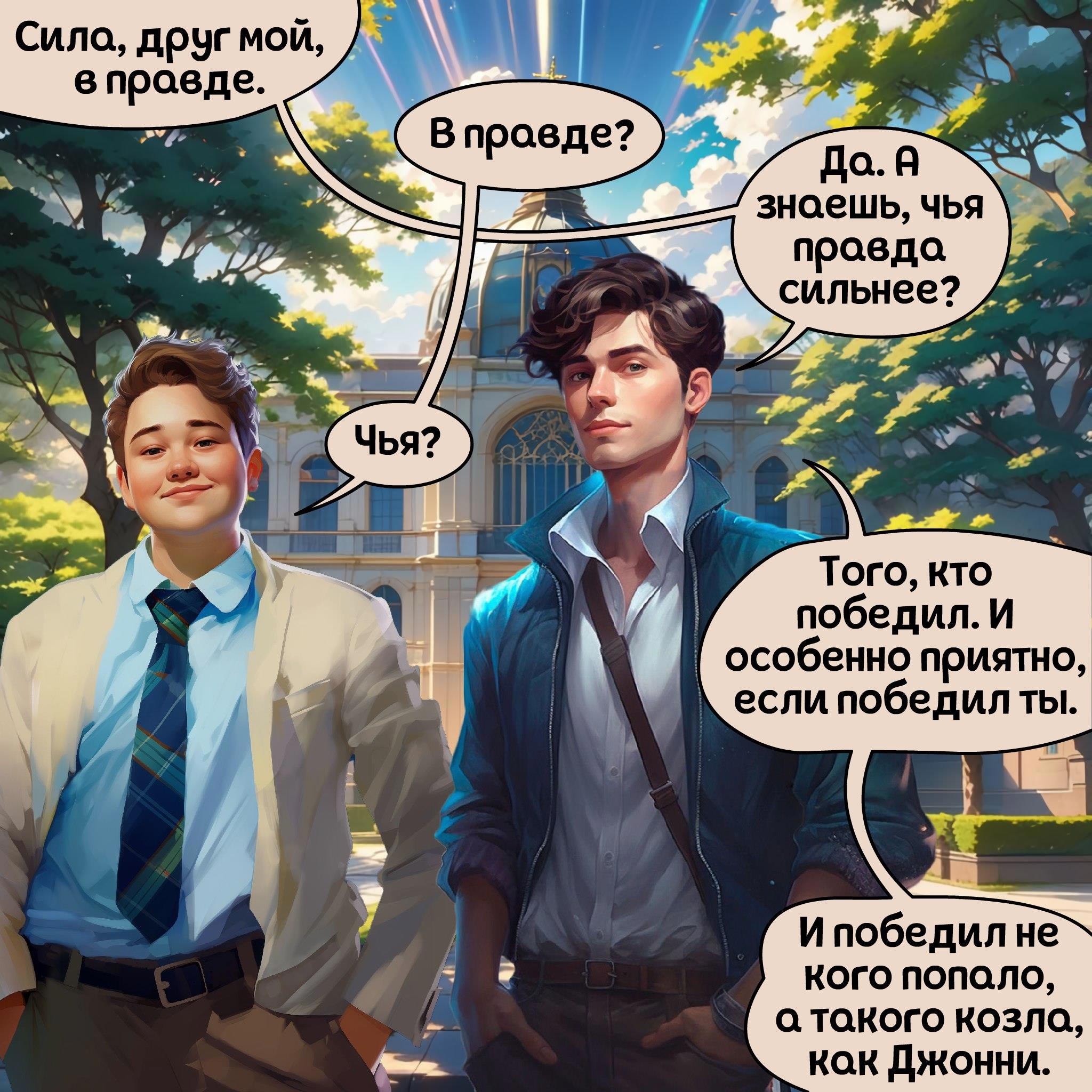 Во-вторых, мне там сделали шикарный баннер или... Даже не знаю, как назвать. Крутой комикс, на основе диалога из книги. Персонажи взяты с карточек, которые можно увидеть в допах к первому тому "Самозванца" и тут в блогах. Остальное - результат фотошопной магии, которой владеет админ канала.