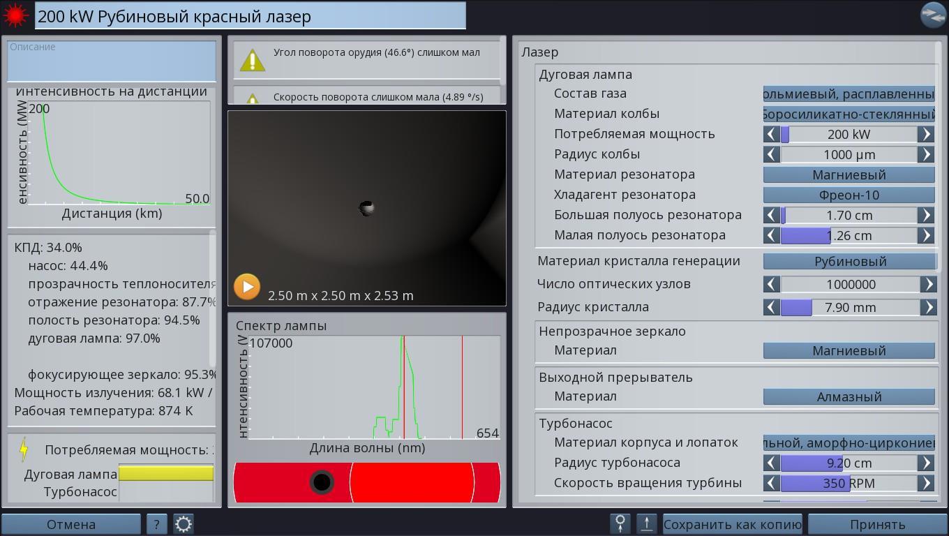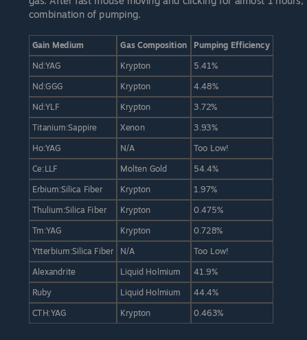 Да, лазер на Ce3+:LiLuF4 оказался не единственным доступным к моделированию лазером в игре с эффективностью выше 10%. В сообществе нашлась вот такая табличка: