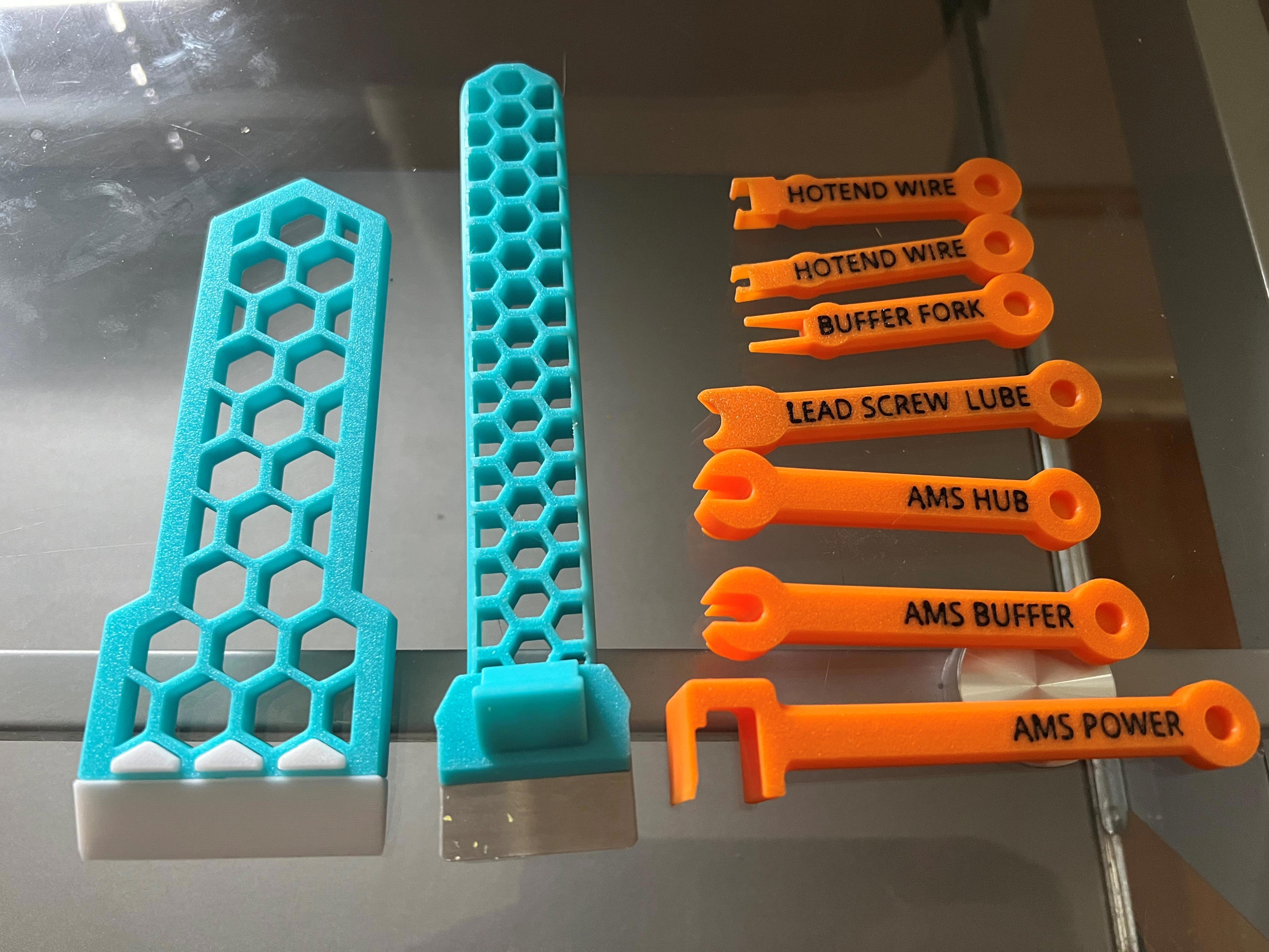 Возможно, дело в не самом лучшем филаменте. Или не самых лучших режимах печати. Но в любом случае, филамента не переключение цветов уходит столько — на порядок больше, чем на саму модель — что смысла печатать подобное большого нет. Идеально печатать в разных цветах то, где большинство слоёв печатается одним цветом. Например, вот эти инструменты для обслуживания принтера.