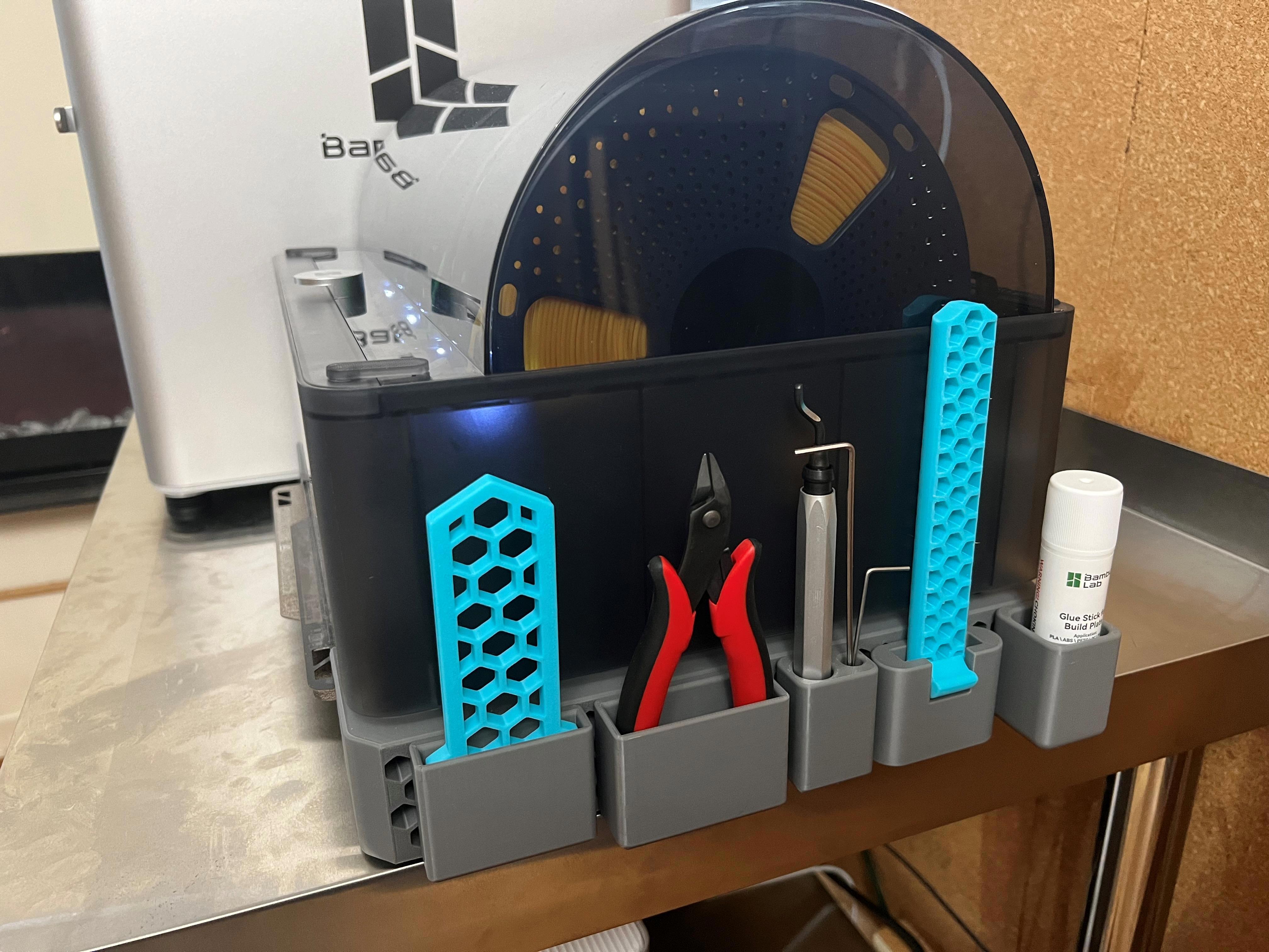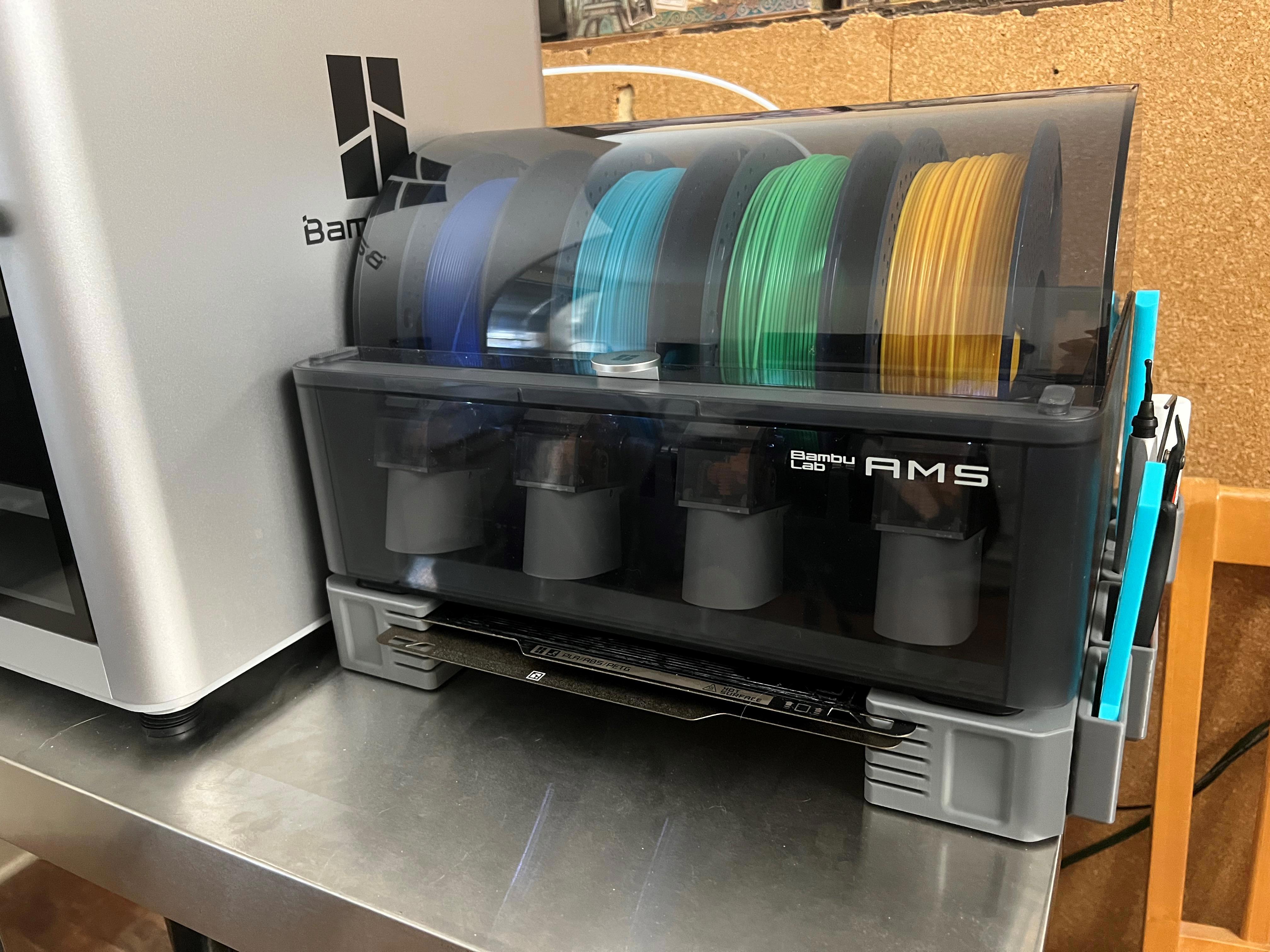 Первый из них, кстати, это не двуцветная печать, это ручка из ПЛА и сменное лезвие из более твёрдой PETG. Для хранения наиболее употребимых из них, а также, платформ, на которых печатаются модели, товарищи посоветовали вот такую подставку под AMS (На что ушла большая часть килограммовой бобины серого филамента). Самая левая держалка сделана во FreeCAD на основе той, что рядом с ней.