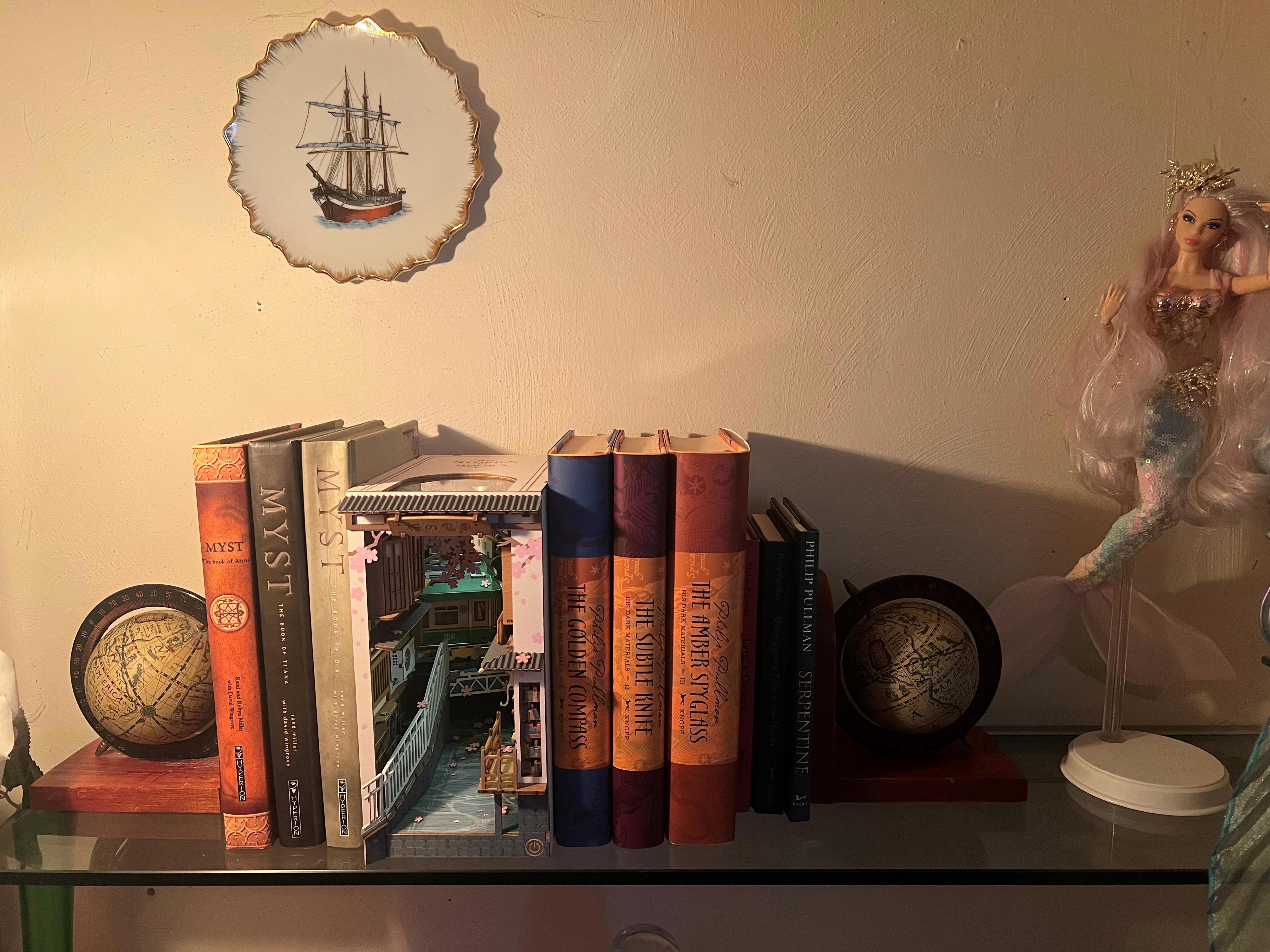 Ещё меня просили показать, как электричка с сакурой среди книг смотрится. Окончательного места ей всё ещё не нашли, но вообще, вот примерно так.