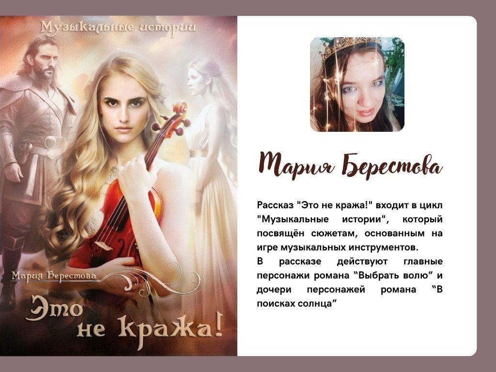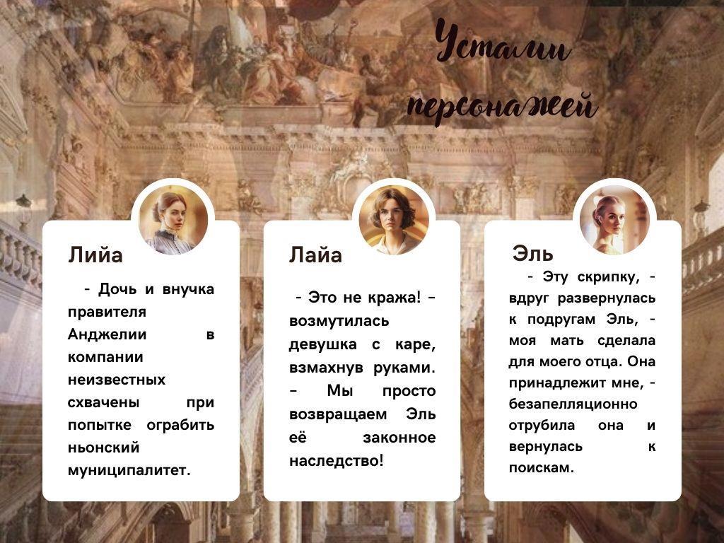 Автор: Мария БерестоваНаписала рассказ про тот день, когда Грэхард впервые увидел Эсну, и про то, как их дочь много лет спустя воровала из ньонского муниципалитета скрипку родителей в компании дочерей персонажей романа "В поисках солнца".