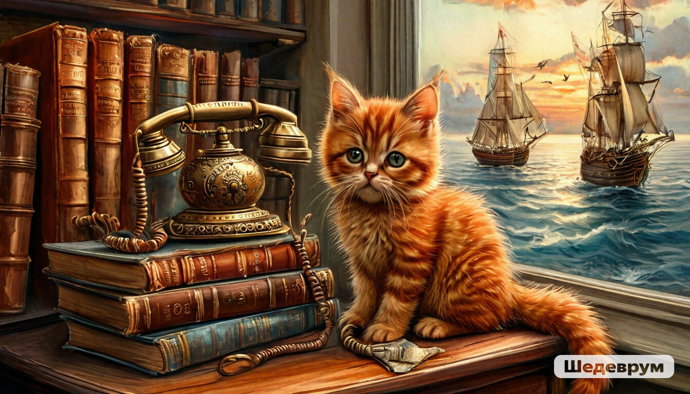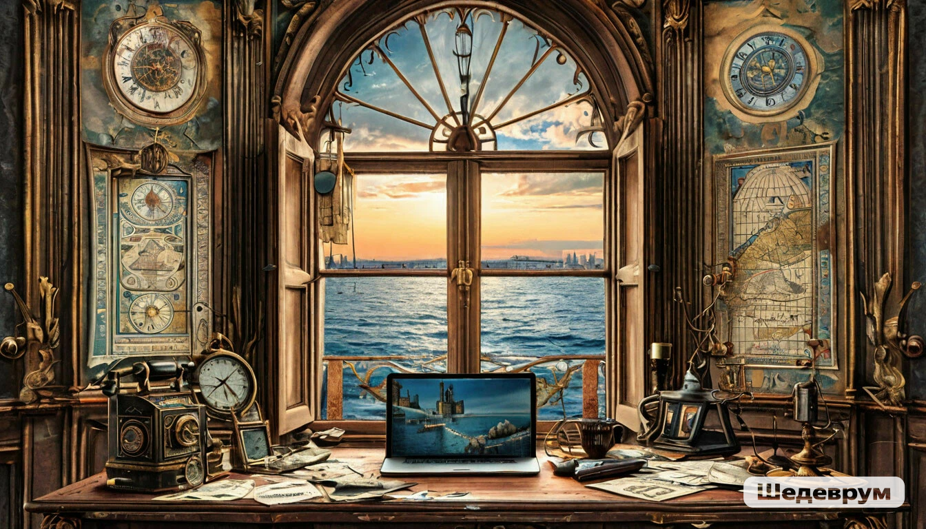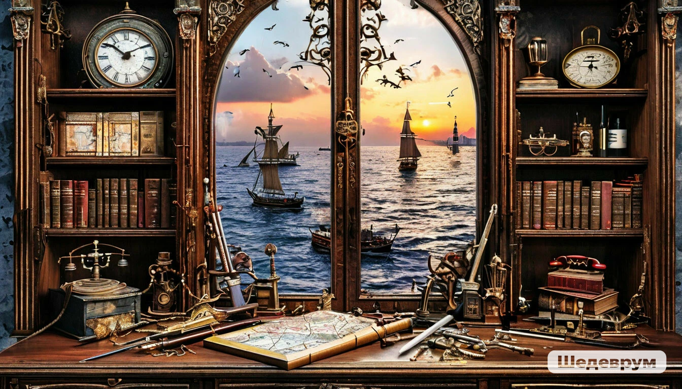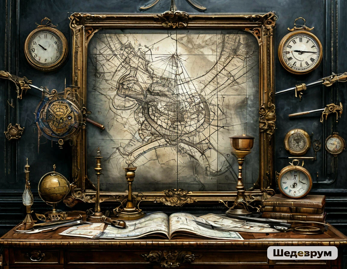 Зачем мне два старинных телефона и двое часов, ума не приложу. Я просил по одному. И географические карты я хотел на стене, а не на сундуке на полке. И развесить по стенам оружие. Тут уж Шедеврум упёрся рогом и не слушался ни в какую. Причем он даже не заявлял о нарушении правил, а просто не рисовал ничего детального и реалистичного.