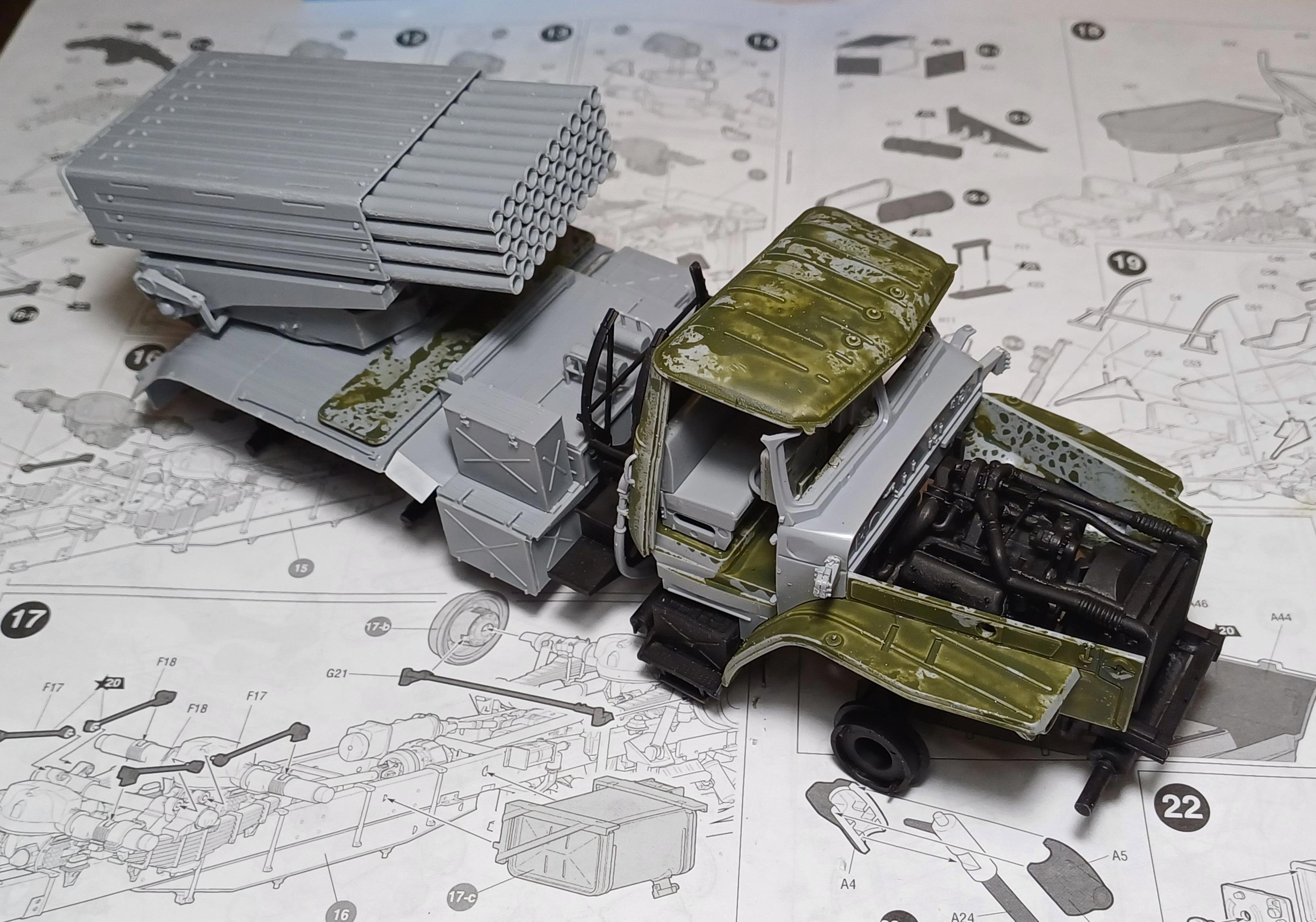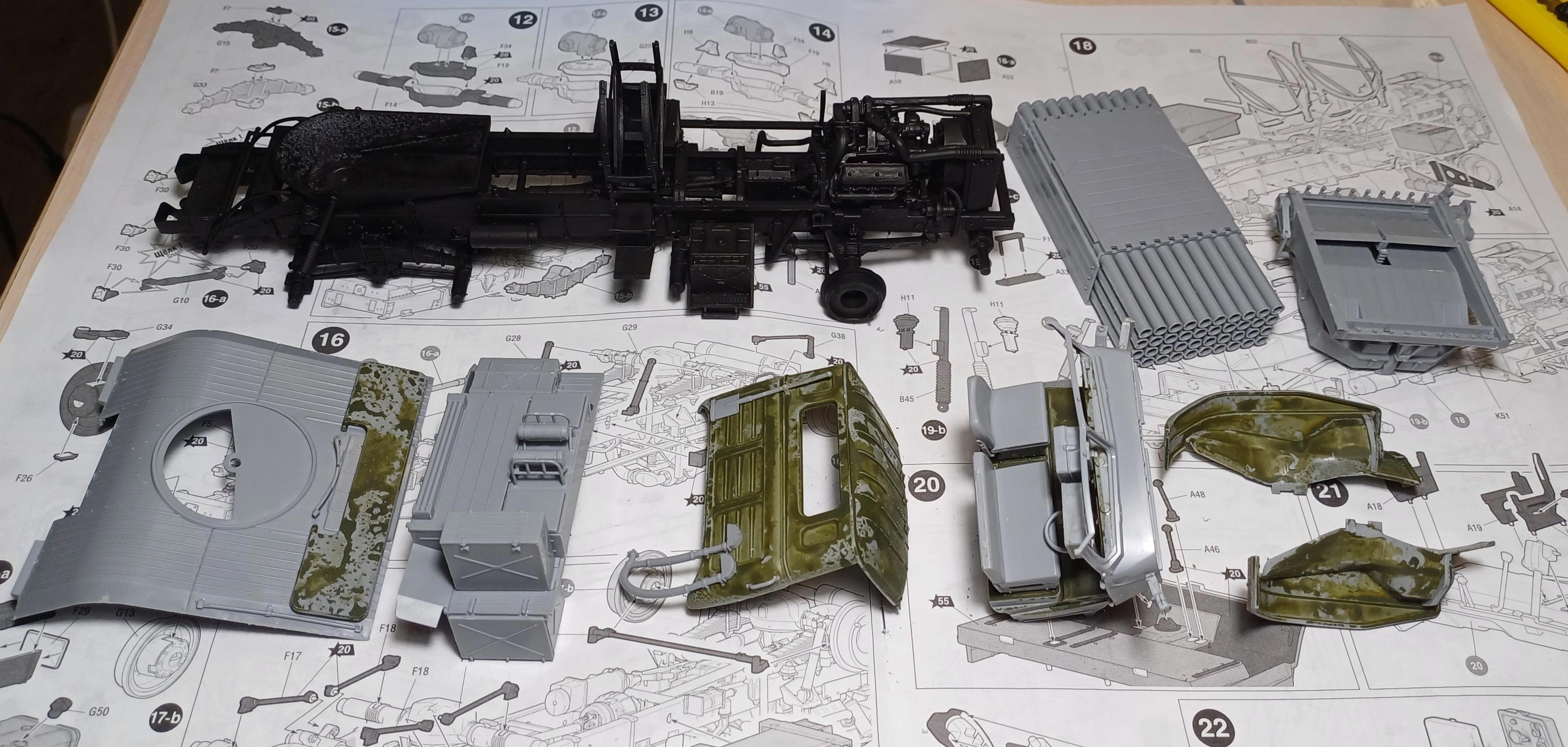 Он не собран - разумеется, для удобства окраски. Защитный цвет из аэрографа ложится не так хорошо, как черный (на фото видно), но слоев 5, как всегда - и должно быть нормально ;)