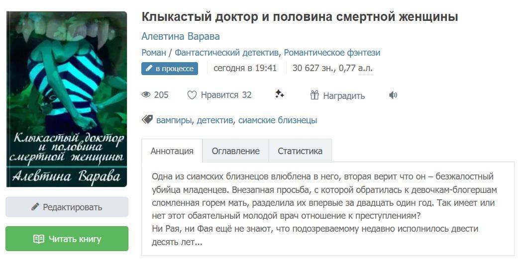 Автор: Алевтина ВараваСкоро это предстоит выяснить двухсотлетнему вампиру Всеволоду. Очень многое свалилось на него в одночасье. Кто-то убивает беременных женщин, крадёт младенцев. Кто-то подозревает в этом его и подсылает ОЧЕНЬ необычных соглядатаев. Даже более диковинных, чем сам Всеволод. Вот только игры в детектива странно закончились для одной из близняшек. Кажется, на неё навалилась первая любовь. А сестра категорически против. Сестра верит, что их поднадзорный - убийца.