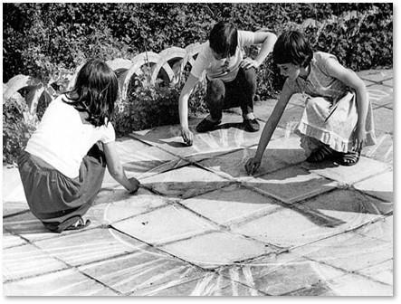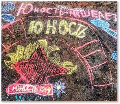 Про идеологическое воспитание детей в лагере никогда не забывали. Одно из мероприятий в этом процессе — конкурс рисунков-плакатов на асфальте.
