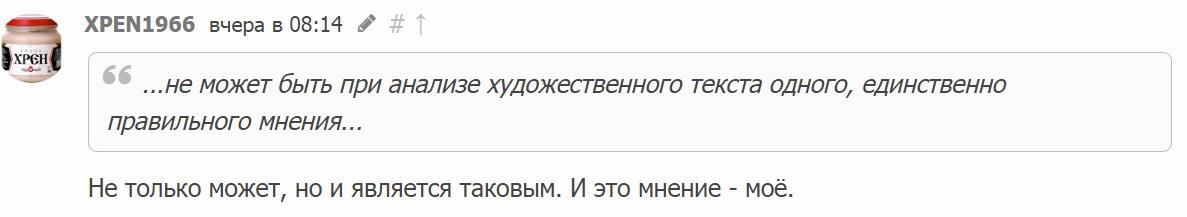 или не хотел понимать. (Я задерганная нападками подобных "критиков" на текст, которые даже не трудятся привести какую-нибудбь аргументацию своему мнению, просто не понимала, как выйти на эти объяснения. И чего человеку не хватает для понимания, почему реакция на его "критику" не как на критику, а на наброс.