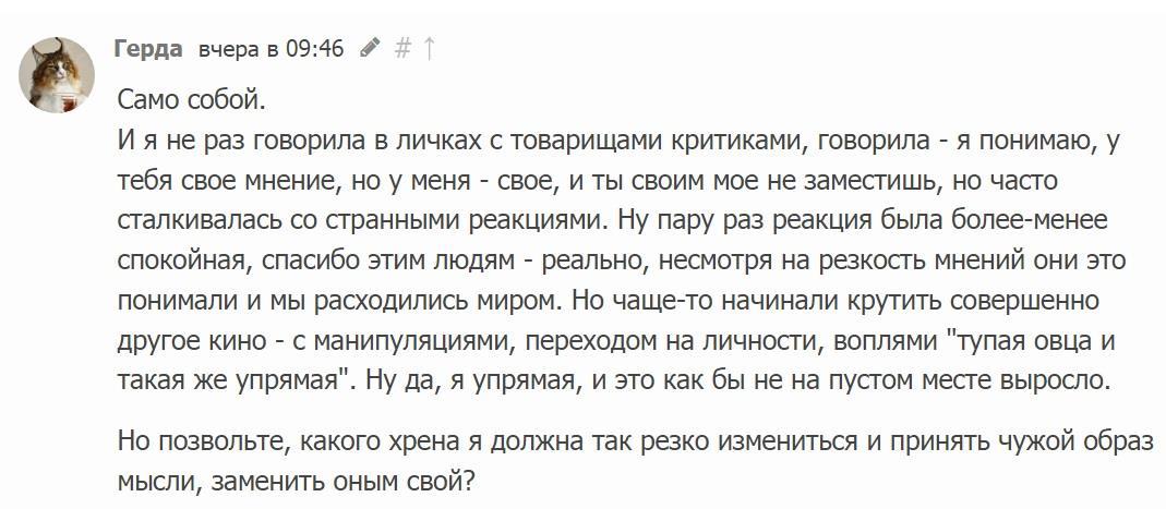 Меня очень сильно удивляет, когда критик по сути переходит на личность автора, точнее, фактически начинает с нее "автор не знает", "автор не умеет", "автор воспевает халатность", при том не приводя никаких аргументов, не показывая никаких рассуждений как он пришел к мысли такой, где в тексте косяки (а может ты финал проигнорировал?), а на полностью симметричный ответ "критик не умеет в критику" впадает в ярость и начинает всем и каждому говорить, что автор "не умеет принимать критику".
