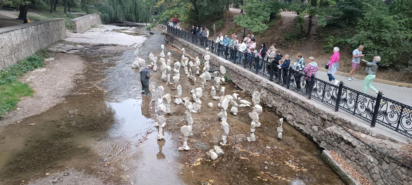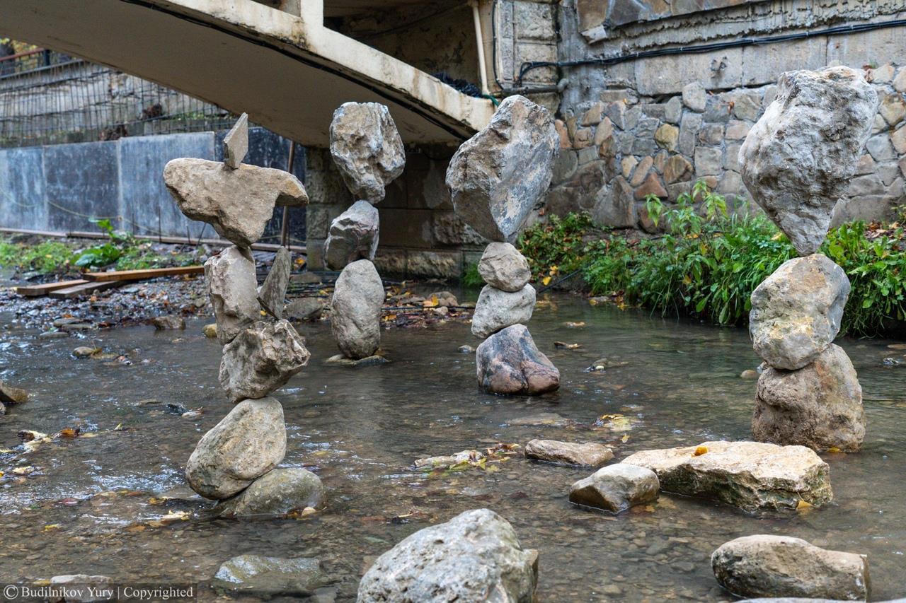 На речке Ольховке, которая протекает с одной стороны Национального парка, строил пирамидки из камней молодой человек. Речка небольшая и иногда бывает очень полноводной. Но в последнее время она обмелела и выглядит как ручей. Так что именно в это время и возможно устраивать такое шоу, вопреки всем правилам равновесия.