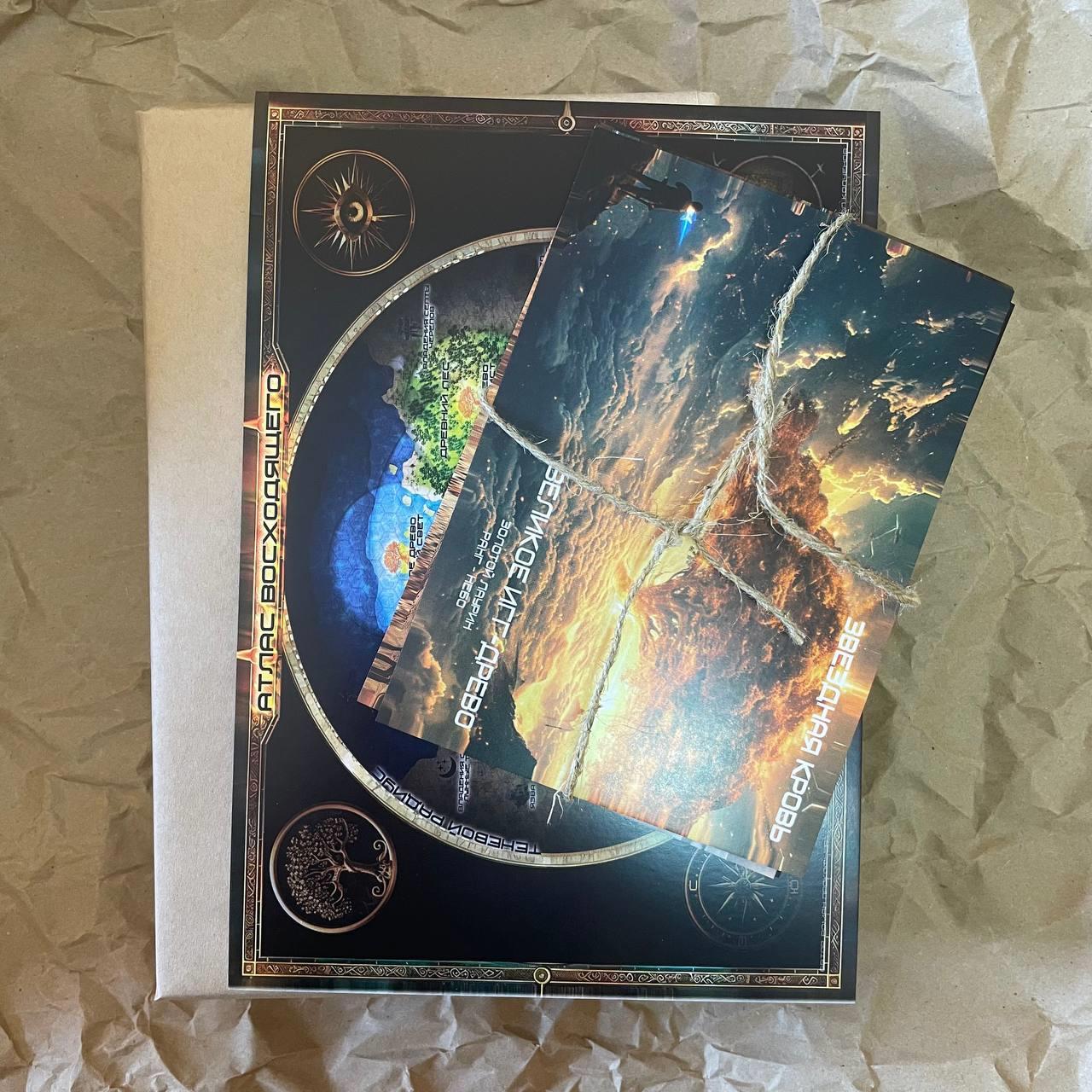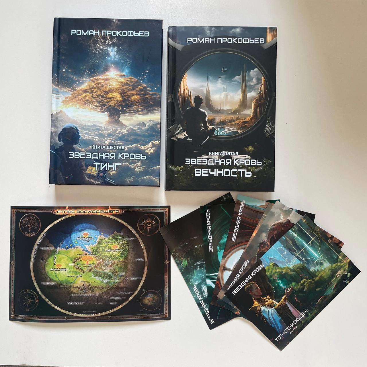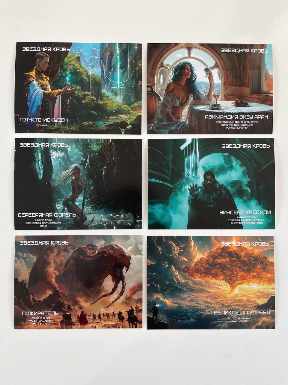 Все наши книжные паки включают уникальный мерч и приятные для фанатов мира Звездной Крови мелочи. Для набора из 5-6 книги мы выпустили шесть открыток с наиболее удачными нейросетевыми иллюстрациями, а также цветную карту Круга в формате а5.