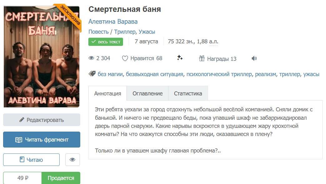 Автор: Алевтина ВараваЭти ребята уехали за город отдохнуть небольшой весёлой компанией. Сняли домик с банькой. И ничего не предвещало беды, пока упавший шкаф не забаррикадировал дверь парной снаружи. Какие нарывы вскроются в удушающем жару крохотной комнаты? На что окажутся способны эти люди, оказавшиеся в плену?