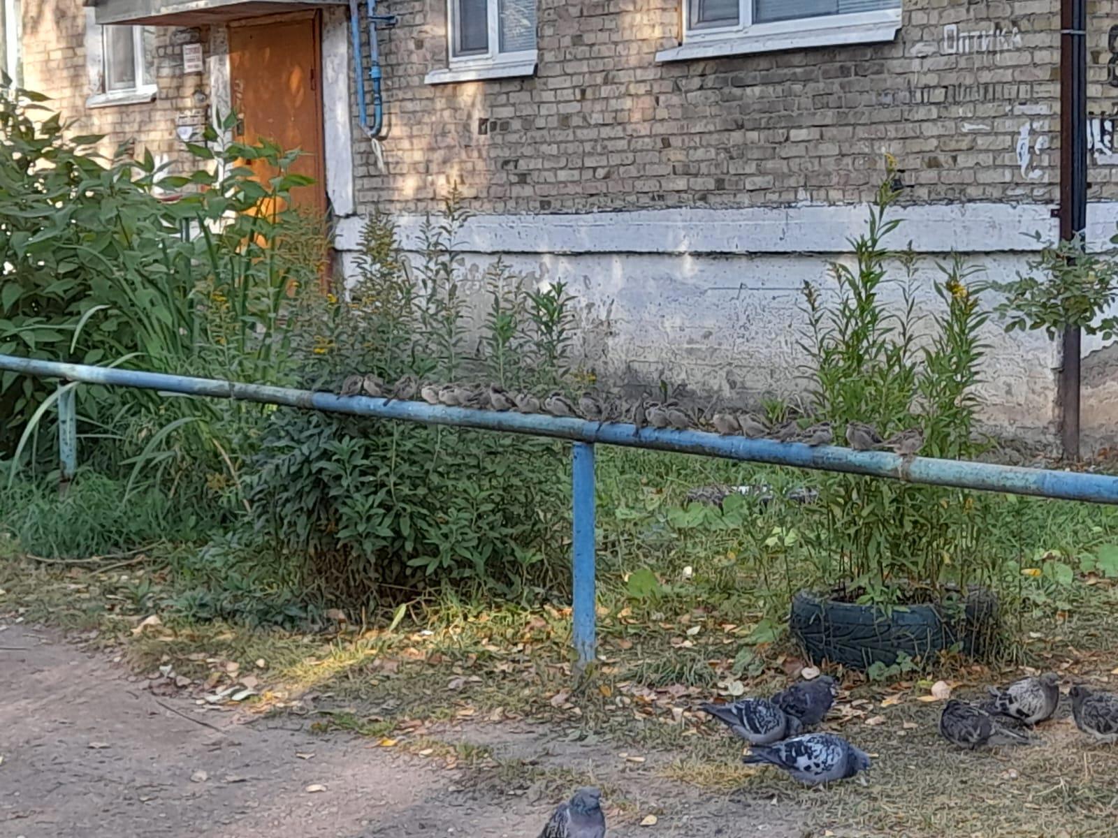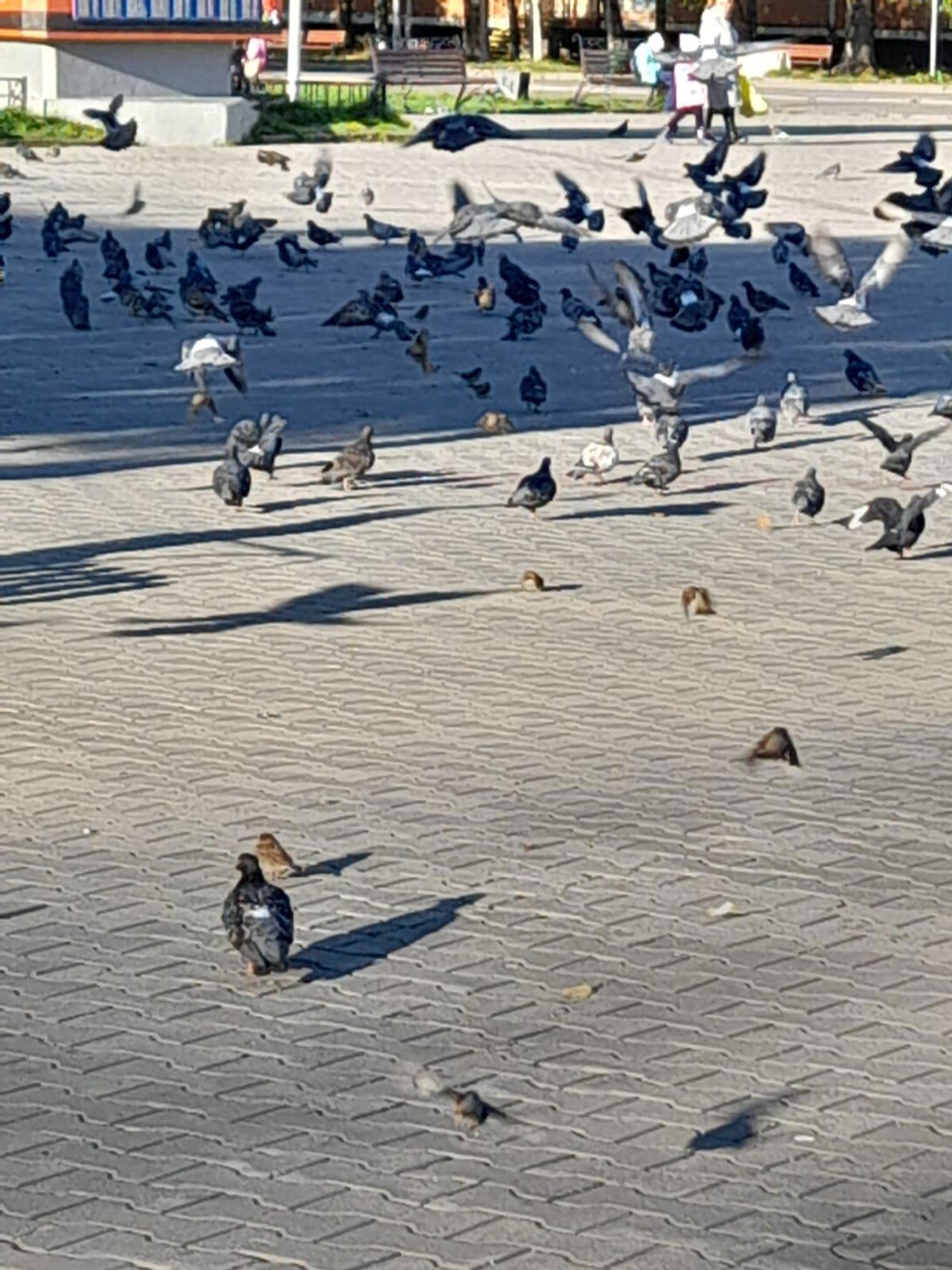 Отвлеклась. О магазинчике: прямо на дорожке возле него по утрам уже несколько раз видела, как женщина подкармливает голубей. И воробьев. Затем походила по площади: там большая стая, прикормленная, людей совсем не боятся. И малявки, и крупные ребята.