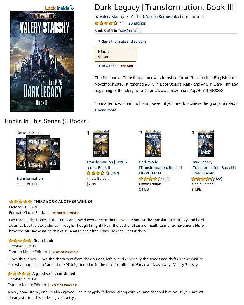 Автор: Валера Корносенко"Трансформация" Валерия была моей первой книгой на Амазоне. Она взорвала рынок и, чего уж там, сделала мне "имя". Сегодня запущена уже третья книга Валерия на Амазон.