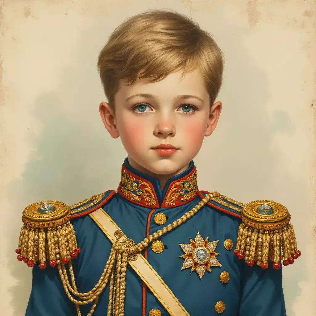 Приятный молодой человек, но явно младше четырнадцати (а видимый возраст был прописан в промпте). Орден от фонаря, странное расположение пуговиц и эполеты с бусинками...
