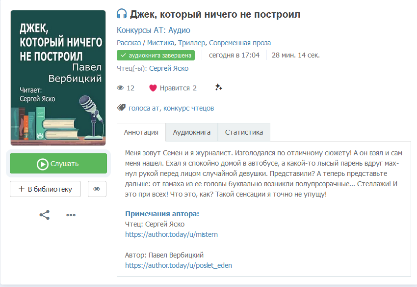 И вот сегодня пришло уведомление, что один из моих рассказов, а именно мистический триллер "Джек, который ничего не построил" https://author.today/work/372748 озвучен Сергеем Яско. Огромное спасибо