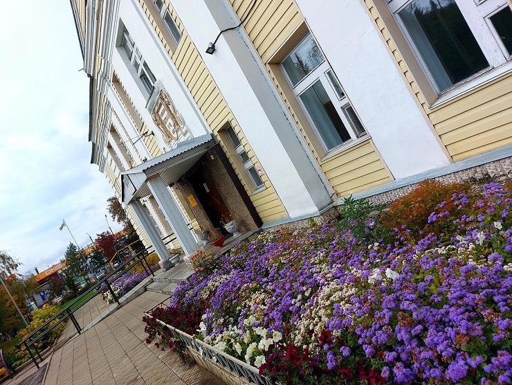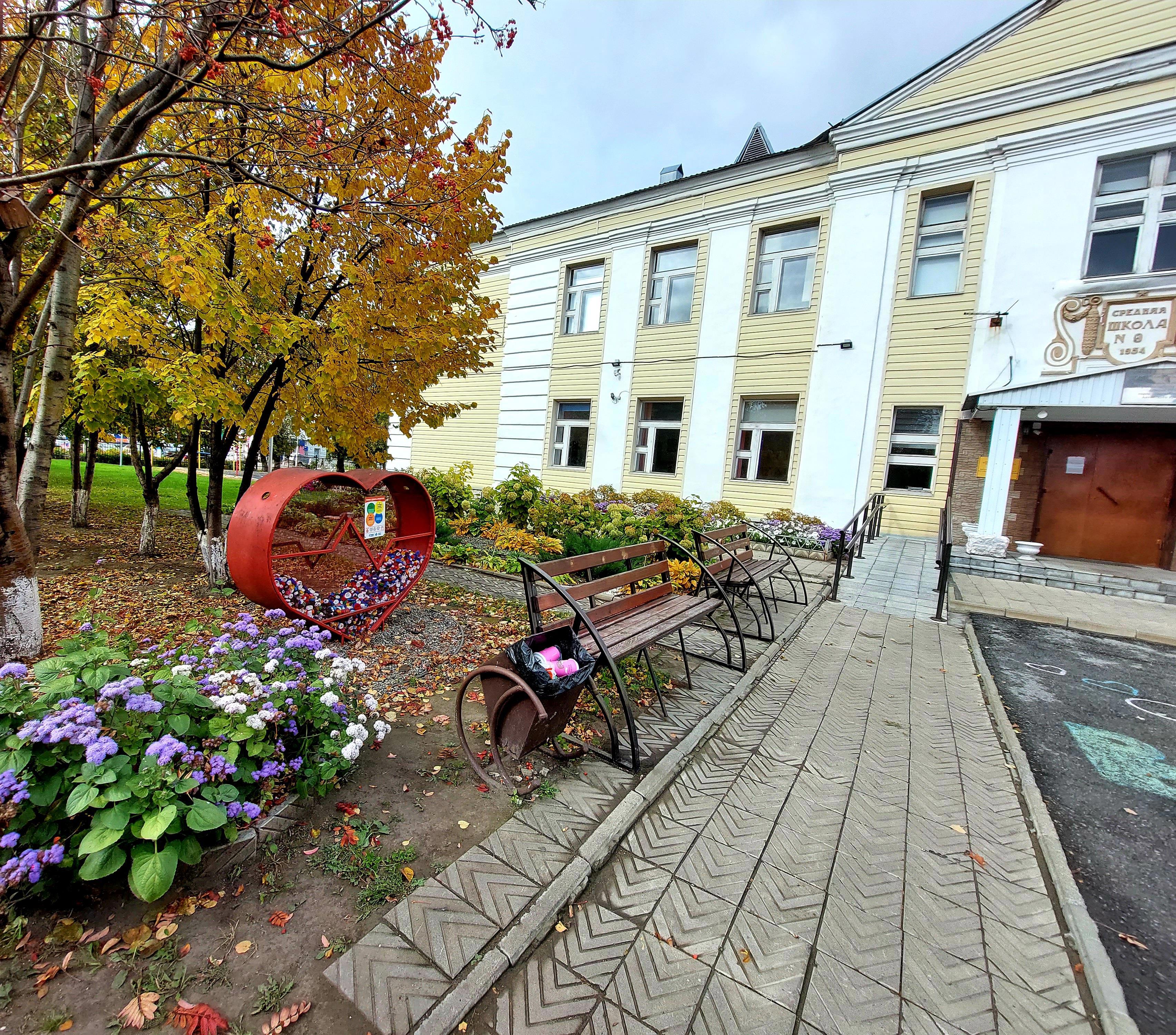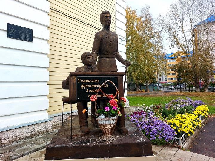 На подходе к учебному заведению нас встретили цветы и памятник учителю!
