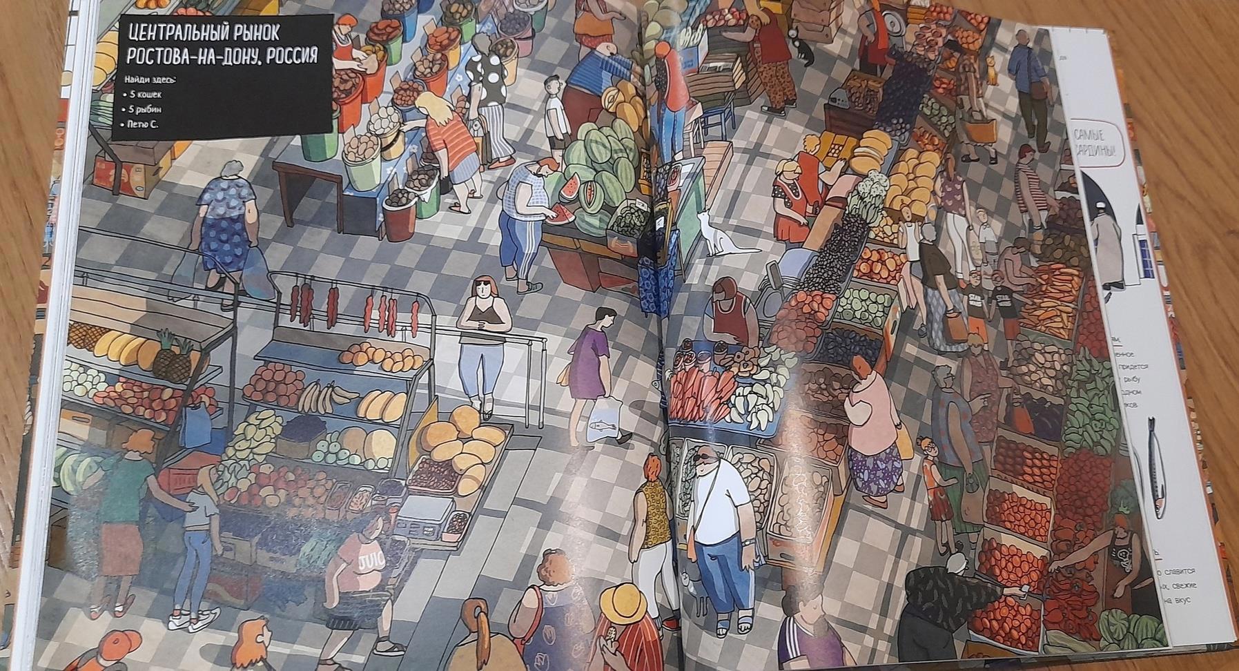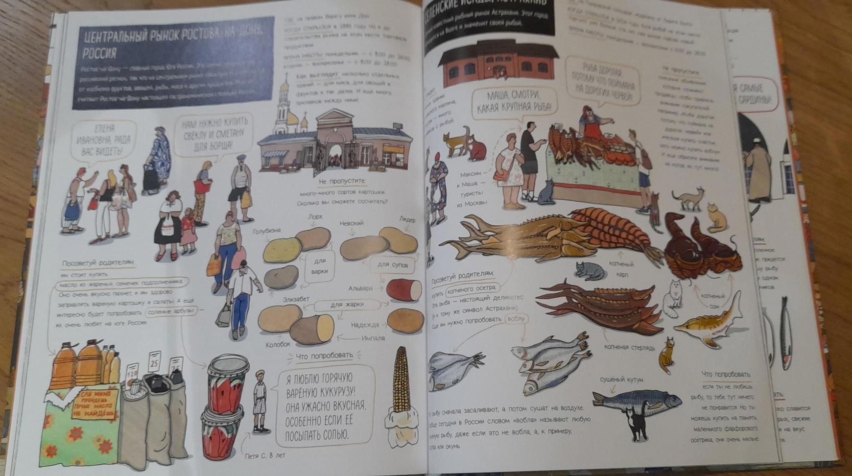 Про это и будет наше путешествие по разным странам мира. Точнее – по рынкам продуктов. Как всё устроено в той или иной стране (очень по-разному). И что же именно продают и покупают на продуктовых рынках той или иной страны? Мне книжка понравилась, в нашем переполненном информацией и разными «образовательными» книжками – очень необычная и нетипичная книжка-путешествие и книжка-энциклопедия.