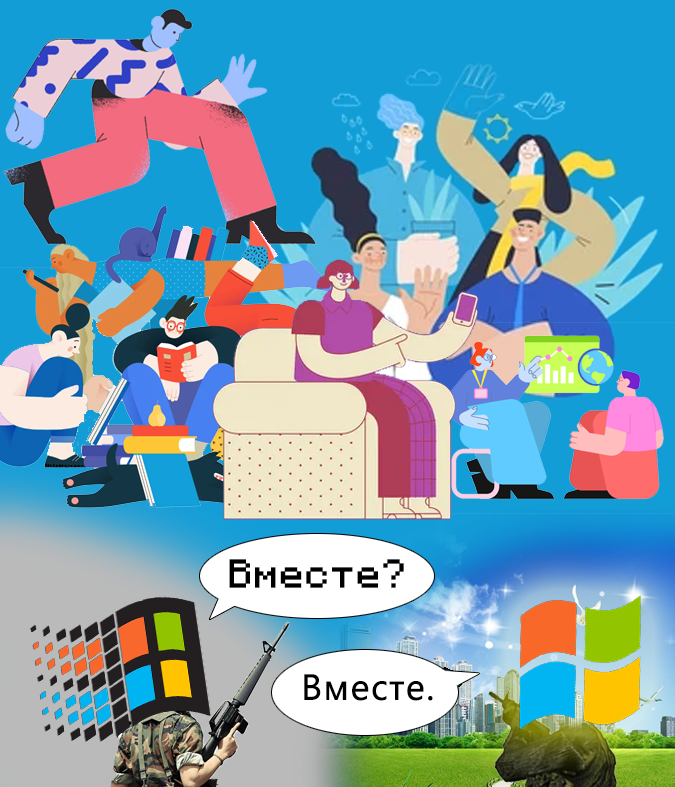 Где-то в Мире Идей идёт война между представителями ностальгических дизайнов, таких как Frutiger Aero, и современным корпоративным Мемфисом. Два её героя - Windows 7 и Windows 98 - пытаются отбиваться от полчищ непропорциональных и простенько нарисованных разноцветных улыбающихся человечков...