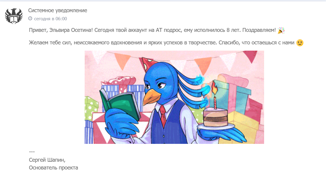 Сегодня мне пришло такое вот системное поздравление от сайта. Оказывается я тут уже 8 лет!