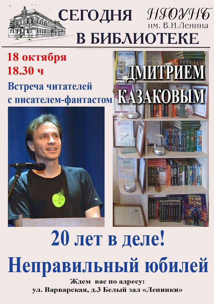 Сегодня -- 18 октября -- в 18.30 в Белом зале Нижегородской областной библиотеки состоится встреча с писателем-фантастом Дмитрием Казаковым. Не пропустите!