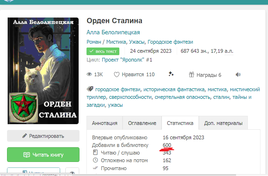Данная книга у меня - самая успешная по соотношению просмотров и добавлений в библиотеки.«Орден Сталина» - первый роман в цикле историко-мистических детективов «Проект "Ярополк"». Основное действие этой пугающей истории, которая по жанру смыкается с городским фэнтези, разворачивается в Москве в 1935 году. И, хоть главный герой книги, Николай Скрябин - лицо вымышленное, зато окружают его самые, что ни на есть, подлинные исторические персонажи. И товарищ Сталин - только один из них! Удастся ли молодому герою выдержать все выпавшие на его долю испытания и не сплоховать в таком окружении? Он бесстрашен и хитроумен, однако и его враги не лыком шиты! И что за награда такая выпадет в итоге на его долю - орден Сталина?