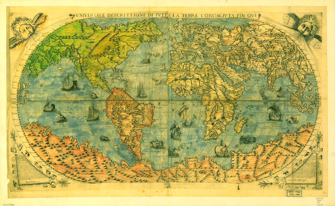 Карта мира, созданная итальянским картографом Ферандо Бертелли и опубликованная около 1565 года в Венеции, носит название "Vniversale Descritione di Tutta la Terra Conosciuta Fin Qvi", что означает "Всеобщее описание известной на сегодняшний день Земли". Эта карта представляет собой интересный взгляд на мир в период, когда многие регионы, такие как Америка и морской путь вокруг Африки в Индию, были лишь недавно открыты и картографированы.