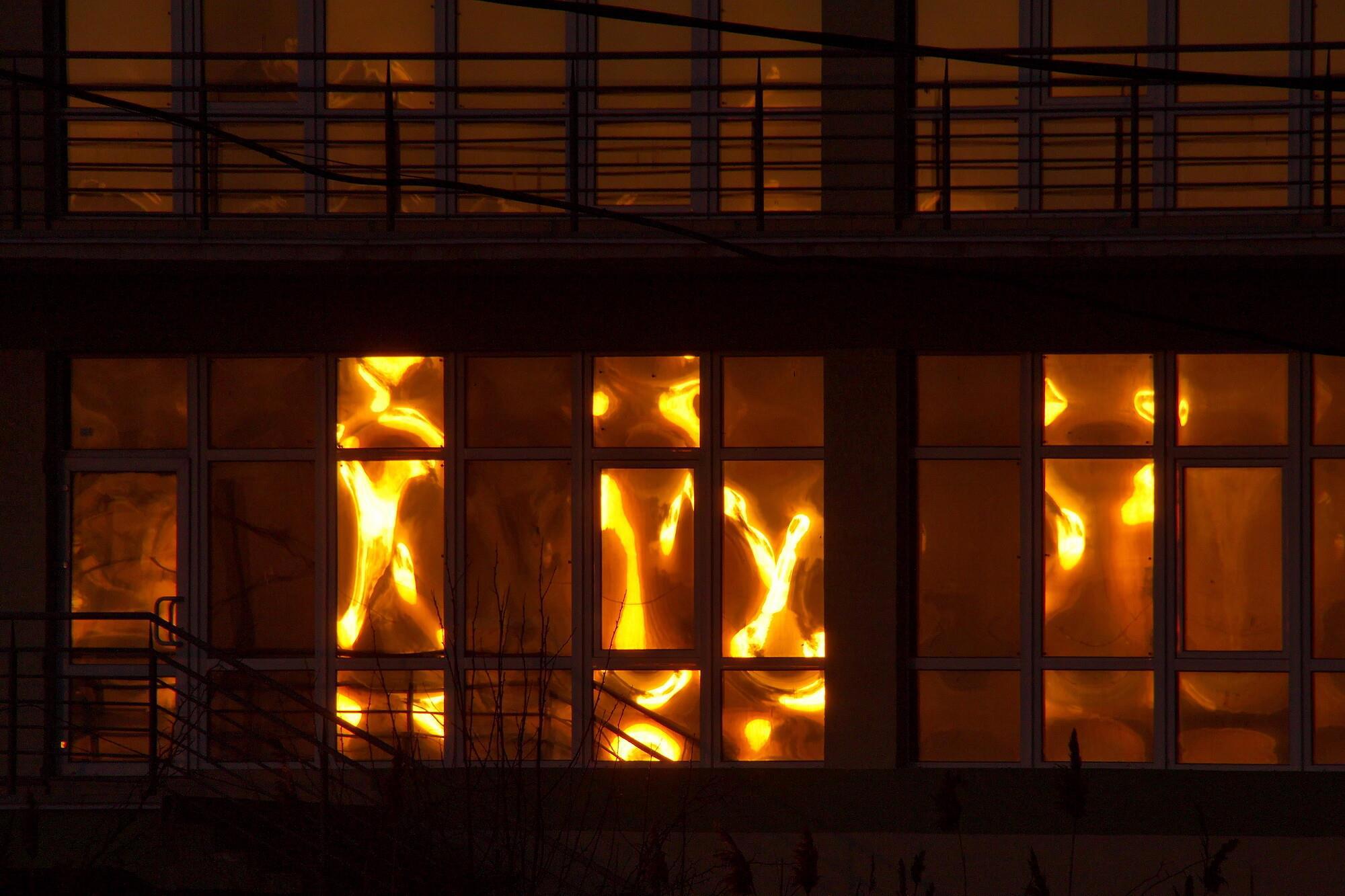 Никакого пожара. Только раннее утро, восход солнца и его пылание в окнах. Сто раз любовалась такими окнами на рассвете и закате, снять удавалось нечасто, всегда выходило хуже, чем помнят глаза.