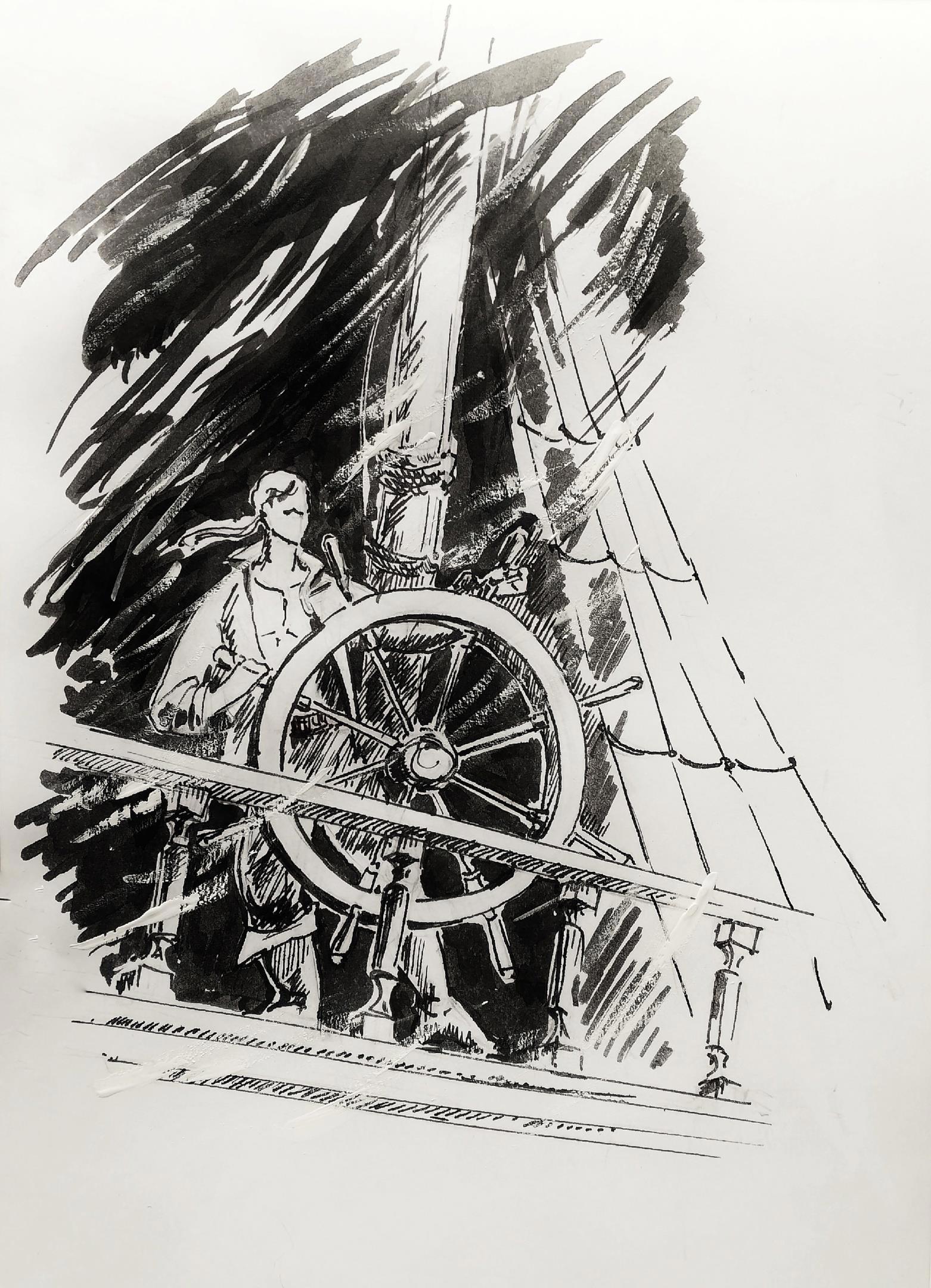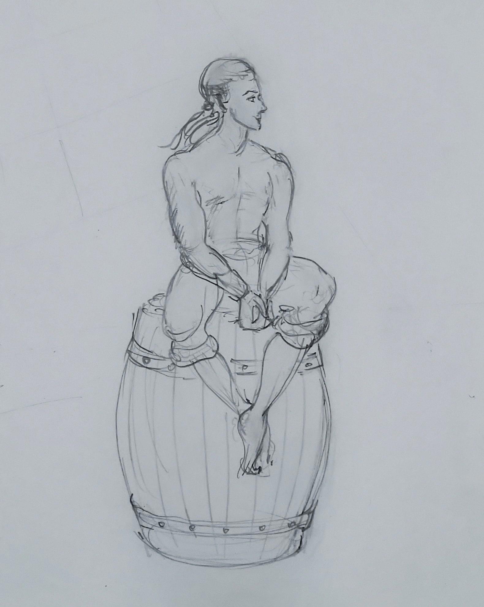 Рядом с юношей, очевидно капитаном нападающих, появился насмешливый полуголый бандит в одних лишь серых штанах и тиснёных кожаных браслетах на руках. Его голубые глаза искрились весельем, русые волосы были стянуты в хвост. Мускулистое тело золотилось загаром, его почти сплошь покрывали татуировки на морскую тематику. Пират отсалютовал капитану карбаса саблей и нахально запрыгнул на бочку у мачты, свесив босые ноги и щурясь на солнце.