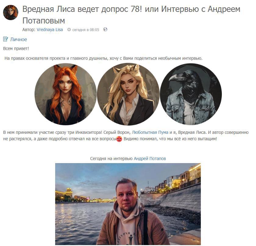Автор: Андрей ПотаповТоварищи, сегодня вышло моё интервью у замечательной Вредной Лисы! Поговорили о писательстве, о морской профессии, о жизни. Мне кажется, получилось очень интересно :)
