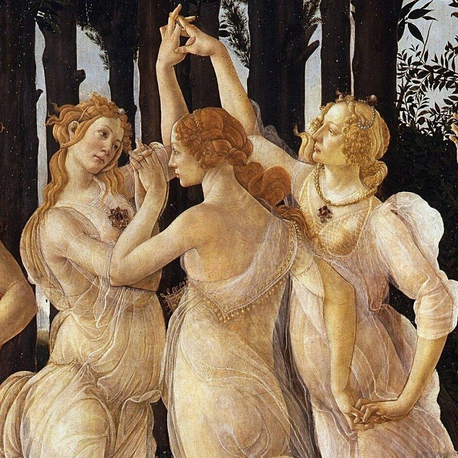 Кроме главных богинь античности, отвечающих за расцвет природы, любовь, рождение новой жизни, плодородие и красоту мира, на картине Боттичелли изображены три грации - прекрасные девушки, Хариты.